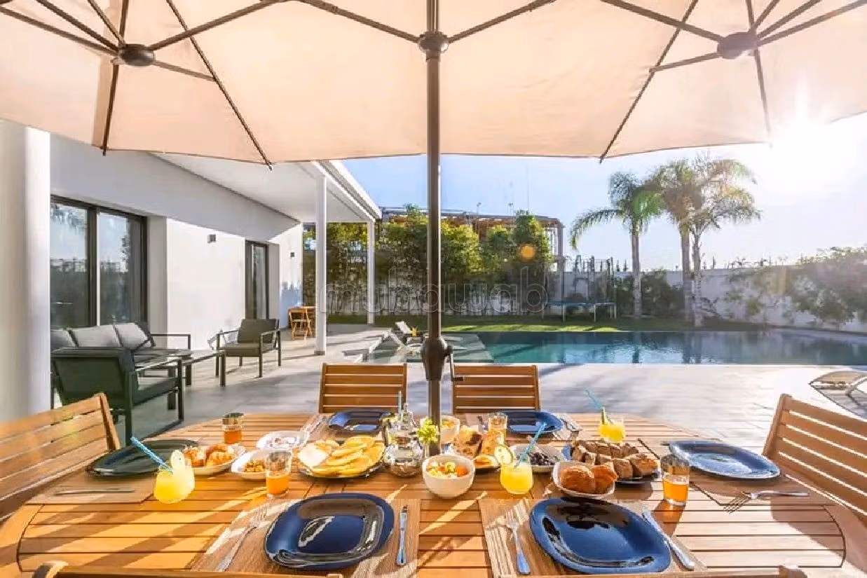 فيلا للكراء بتصميم ممتاز وجيد. السعر 3,500 د.م. غرف 4، 4 حمامات ، 1000 متر مربع. 4 قطع مشرقة. أقل من سنة. خاصية الأرض الرخام . مفروشة بالكامل.