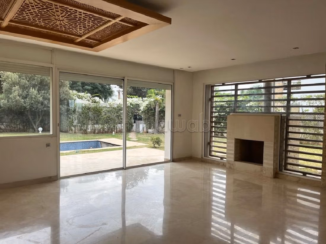 High quality amenities with this villa for rent. Price 26,000 DH. 3 rooms, 3 bathrooms, 600 m². 4 rooms. Less than 5 years. Floor type: Marble. Usable fireplace, Caretaker service available, Property with swimming pool, General air conditioning System.
