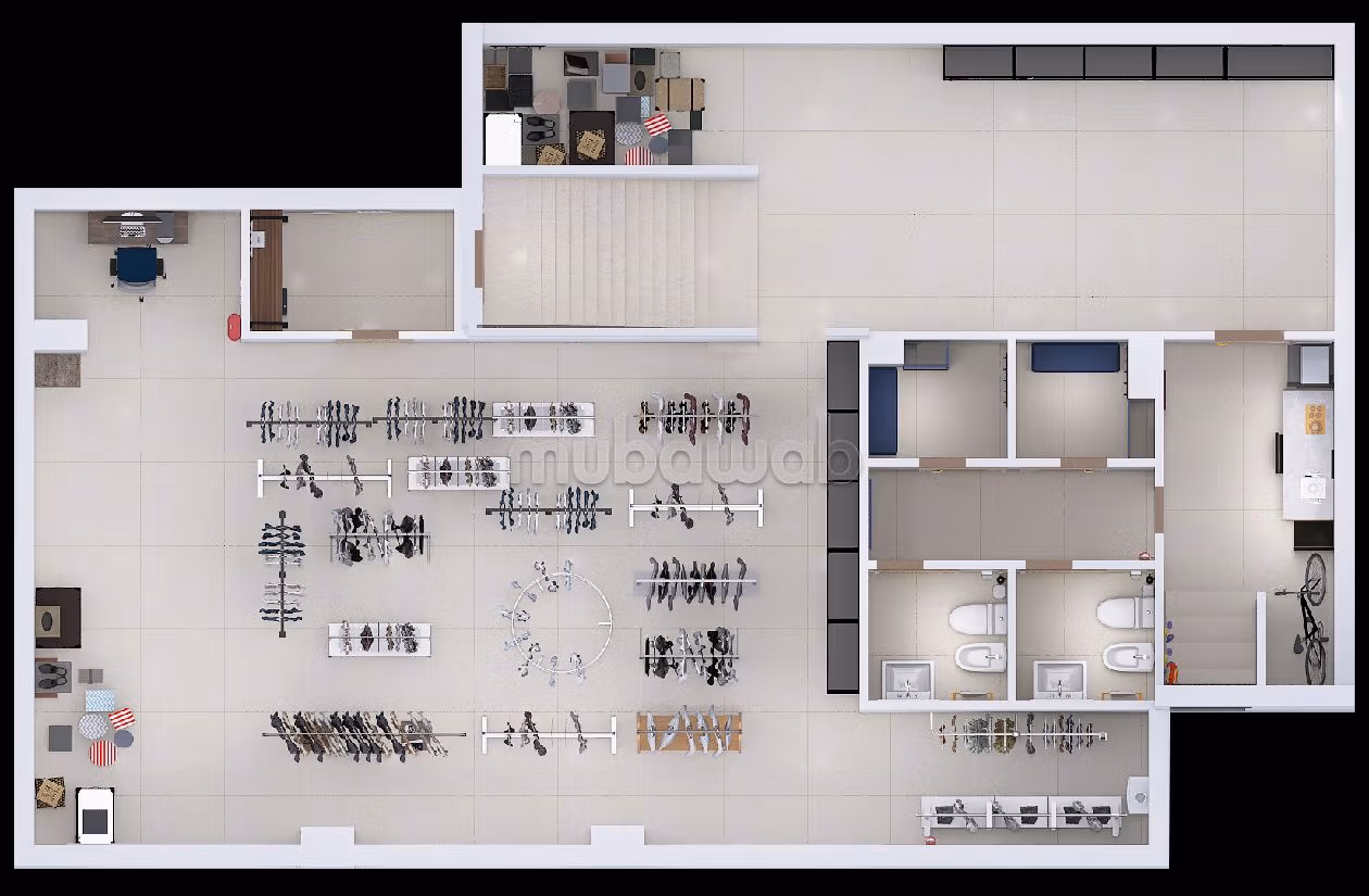 The basement area is thoughtfully arranged for storage, changing rooms, and restroom facilities, providing a comprehensive solution for your business.