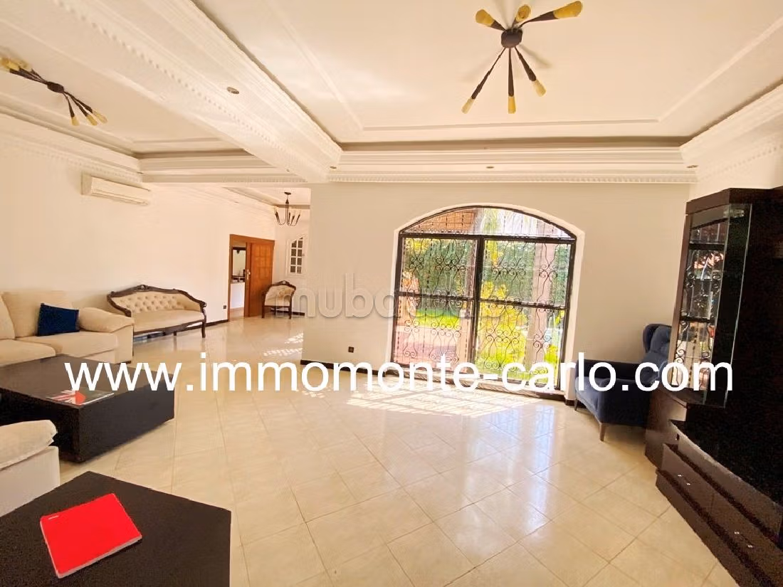 Very nice villa for rent combining luxury and comfort. Price 28,000 DH. 6 living areas, 3 bathrooms, area 350 m². 4 rooms. Good condition. Covering: Marble. The exterior consists of a garden and a terrace. A garage is also at your disposal.