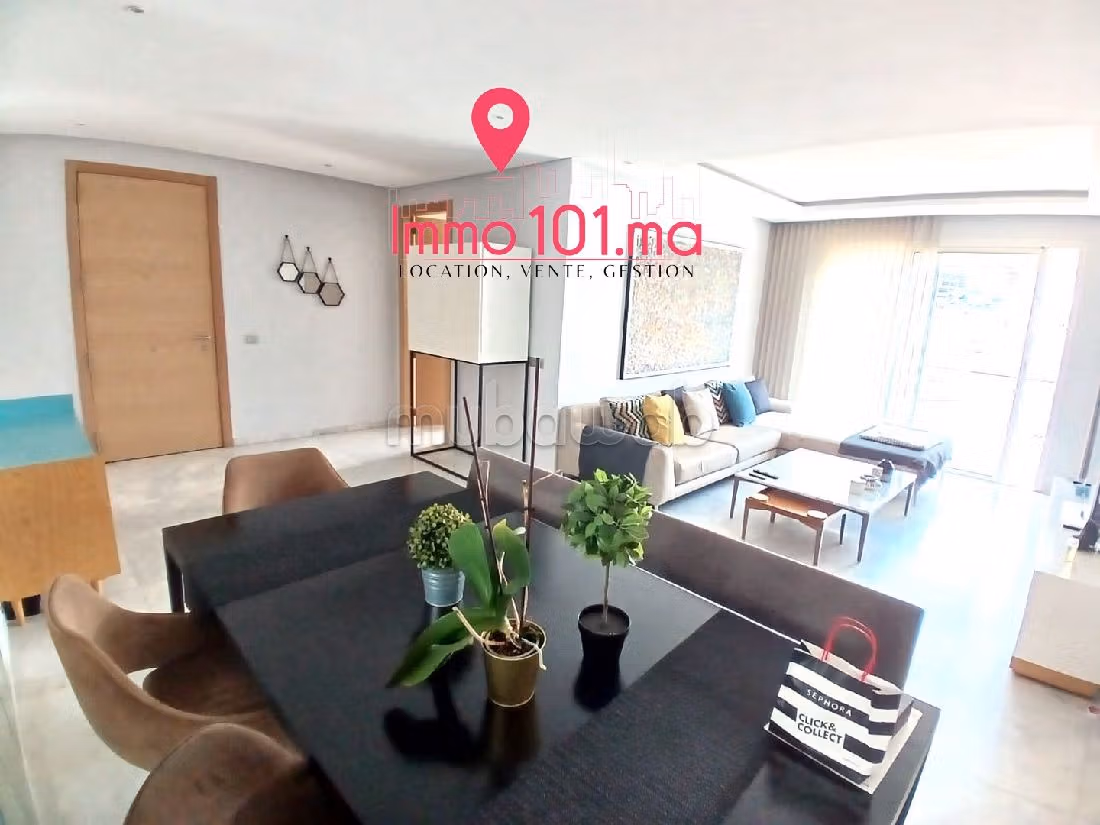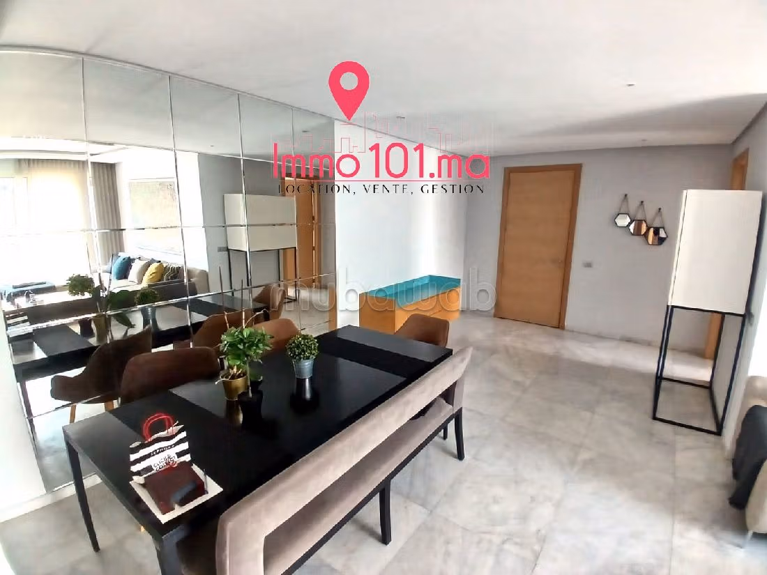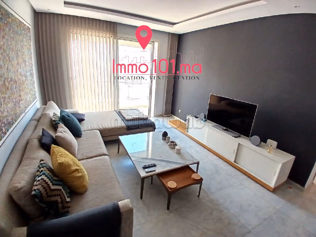 Nice apartment for rent. Price 13,000 DH. 3 living areas, 2 bathrooms, area 100 m². 2 bedrooms. 7th Level. Less than 10 years. Covering: Marble. New furniture.