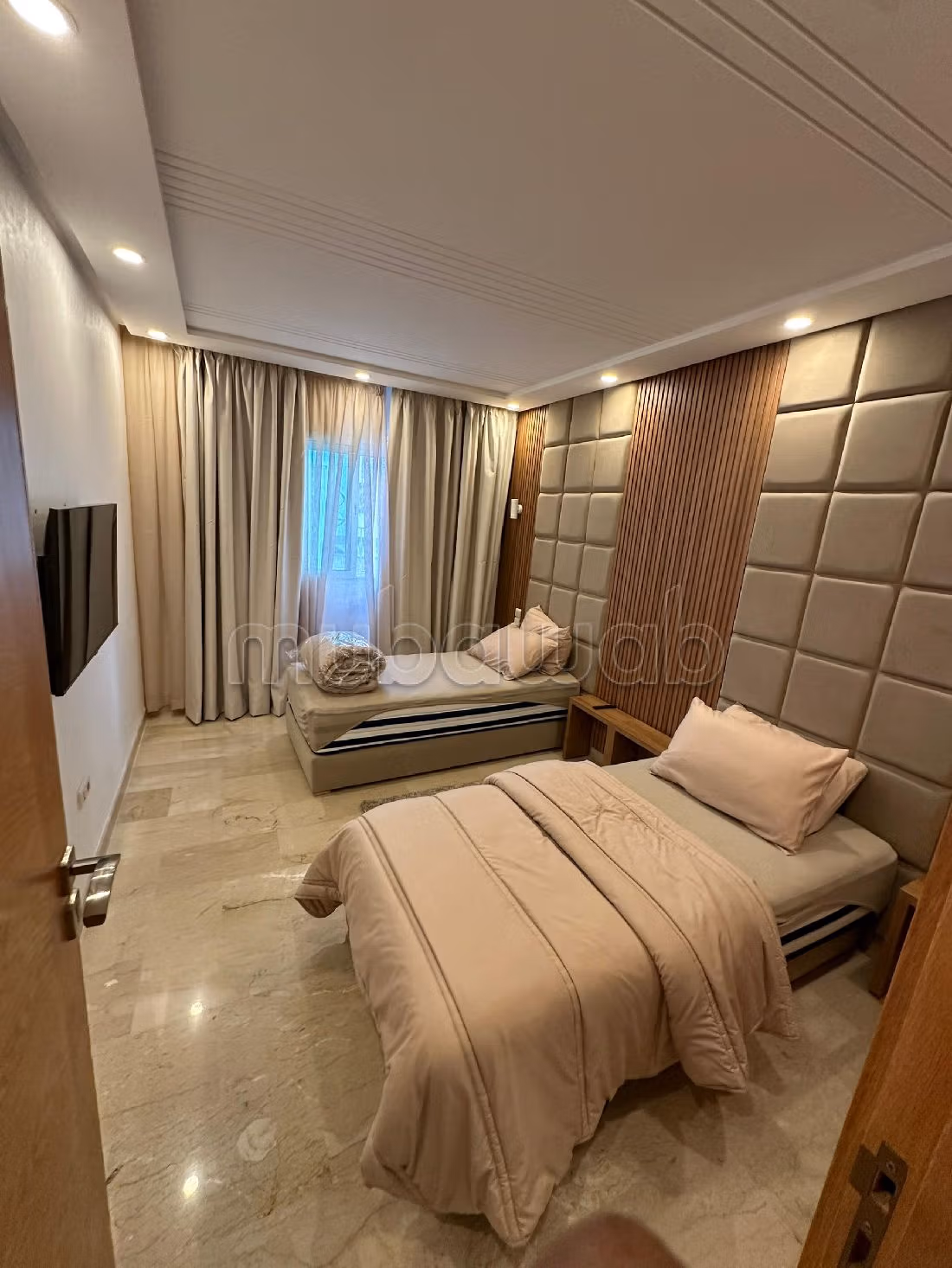 Pisos en alquiler. Precio 1.500 DH. 2 dormitorios, 2 baños, 110 m². 3 habitaciones luminosas. 1º Planta baja. Nuevo. Suelo de moqueta Mármol. Estancia 7. Equipado con una antena parabólica y una puerta blindada. La residencia es segura.