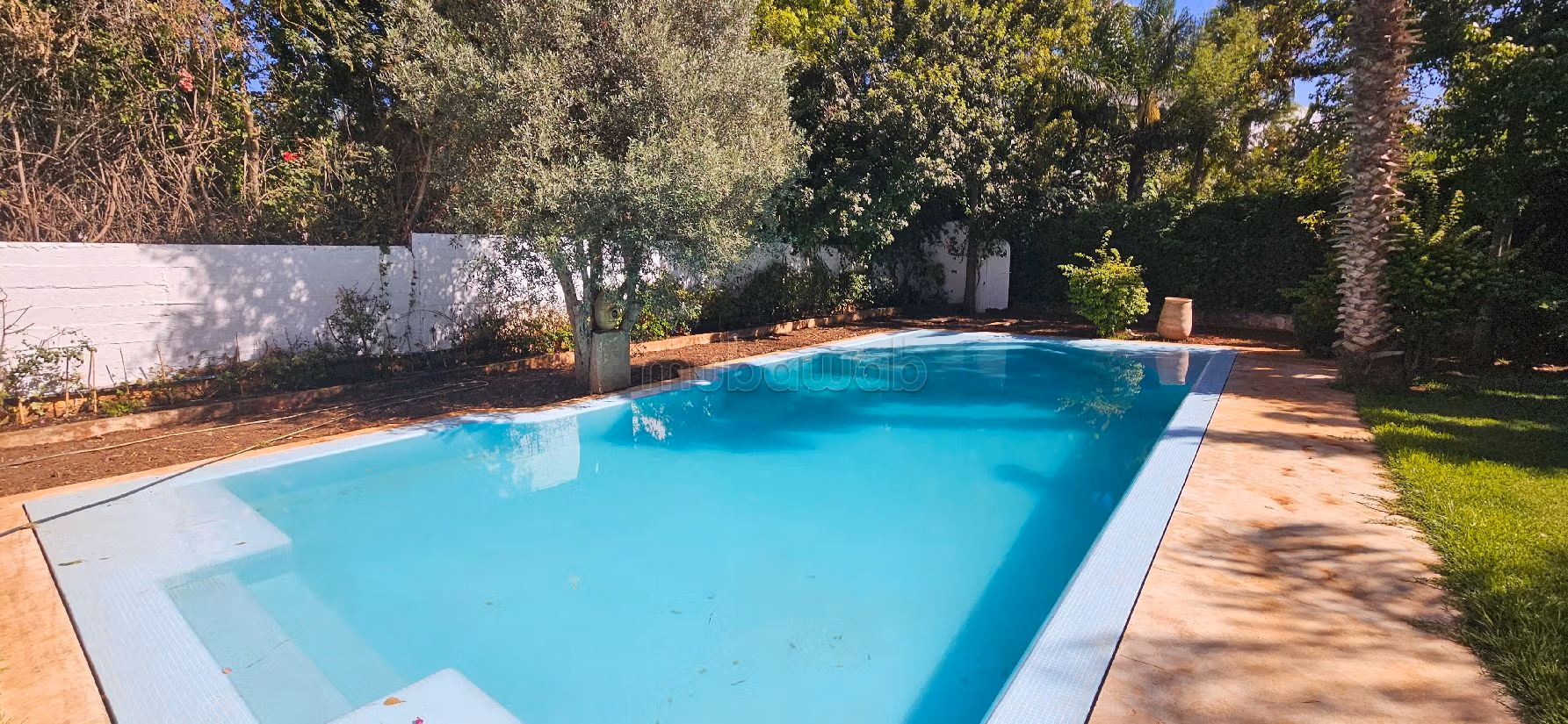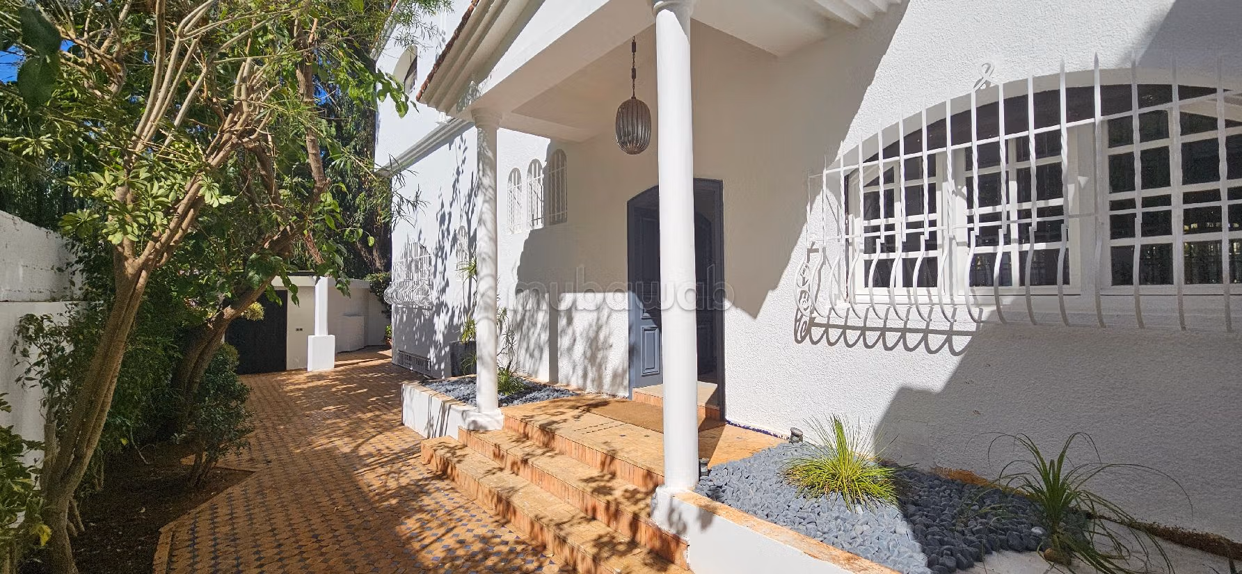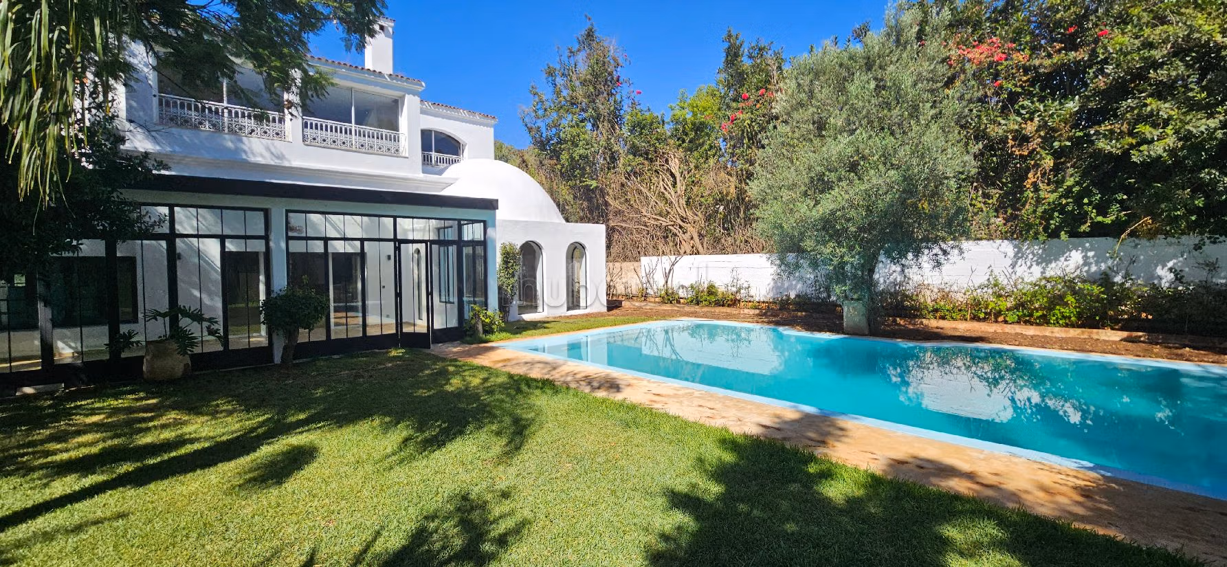 Prestigiosa villa en alquiler. Precio 65.000 DH. 4 dormitorios, 3 baños, área 1000 m². 11 habitaciones luminosas. Buen estado. Tipo de suelo: Mármol. Chimenea operativa, conserje disponible, piscina grande, aire condicionado.