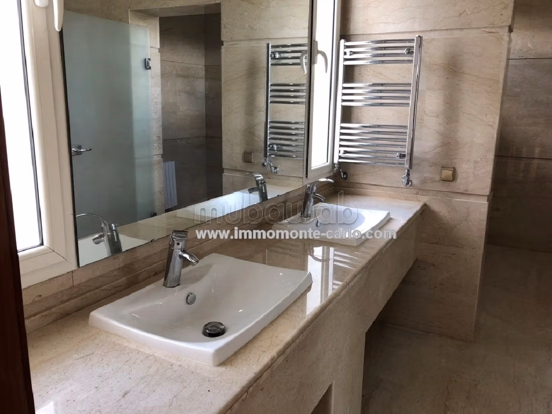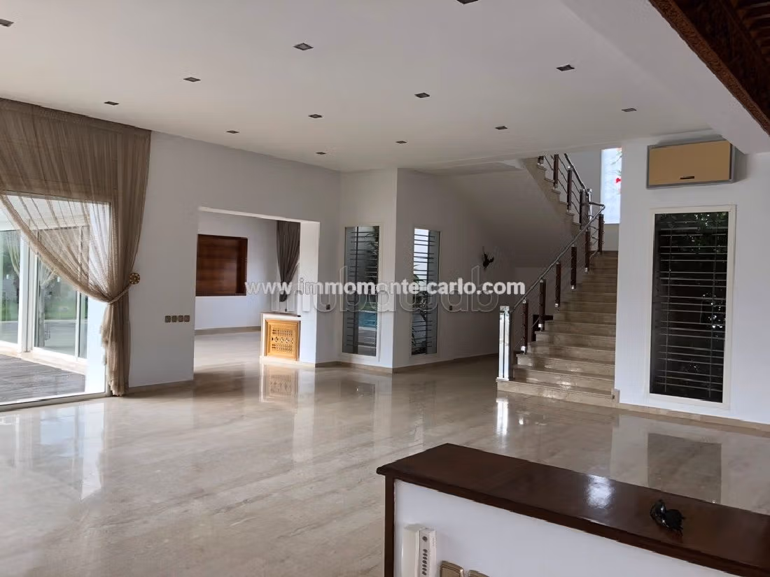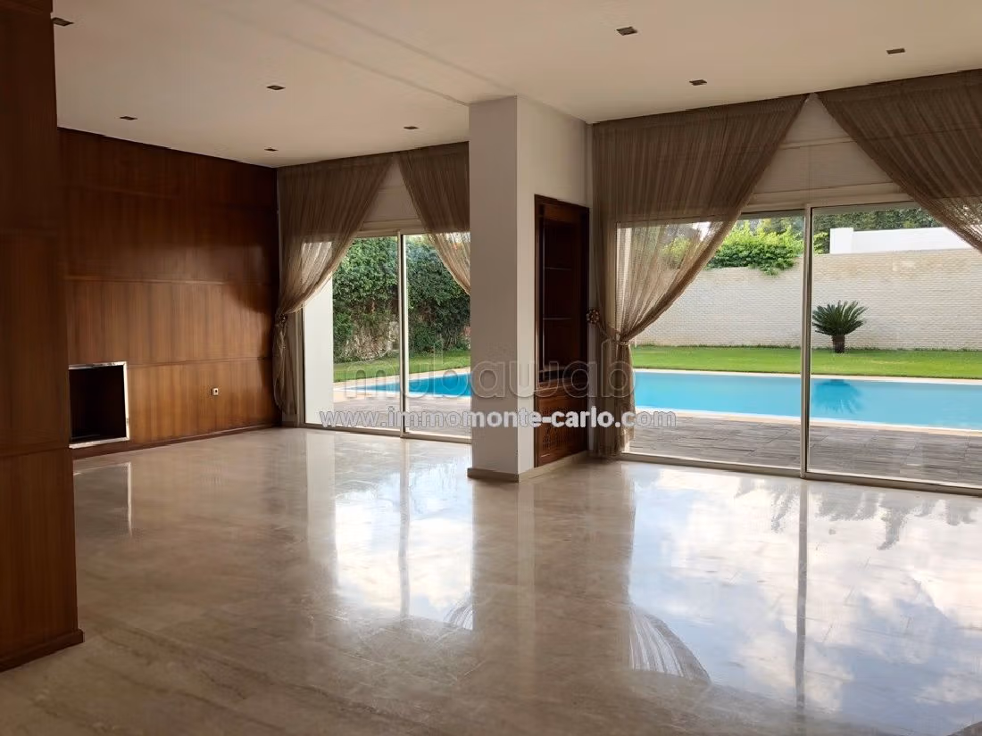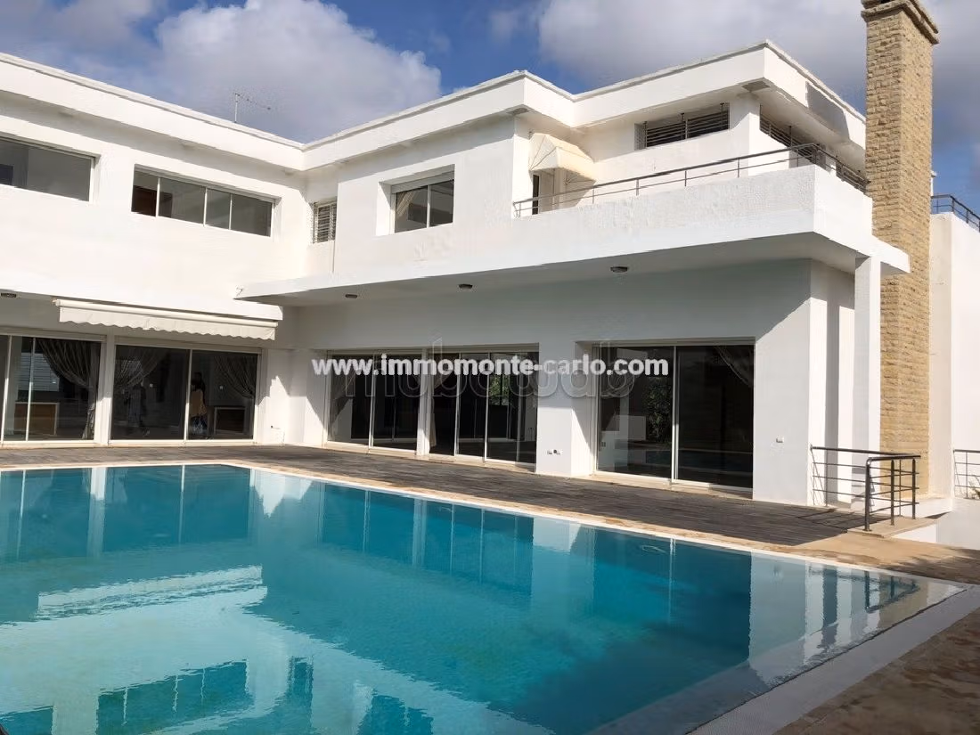 A louer à Rabat villa neuve de très haute standing avec une belle piscine, très bien située et bien sécurisée, avec chauffage central , systèmes d’alarme, Très bien équipés, climatisation, Bain More, Salle de sport, Baie vitrée en Extrudé, Grande piscine, deux façades orienté plein Sud.
