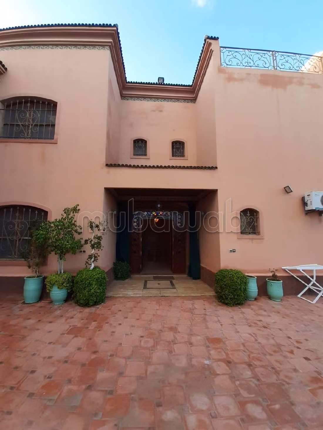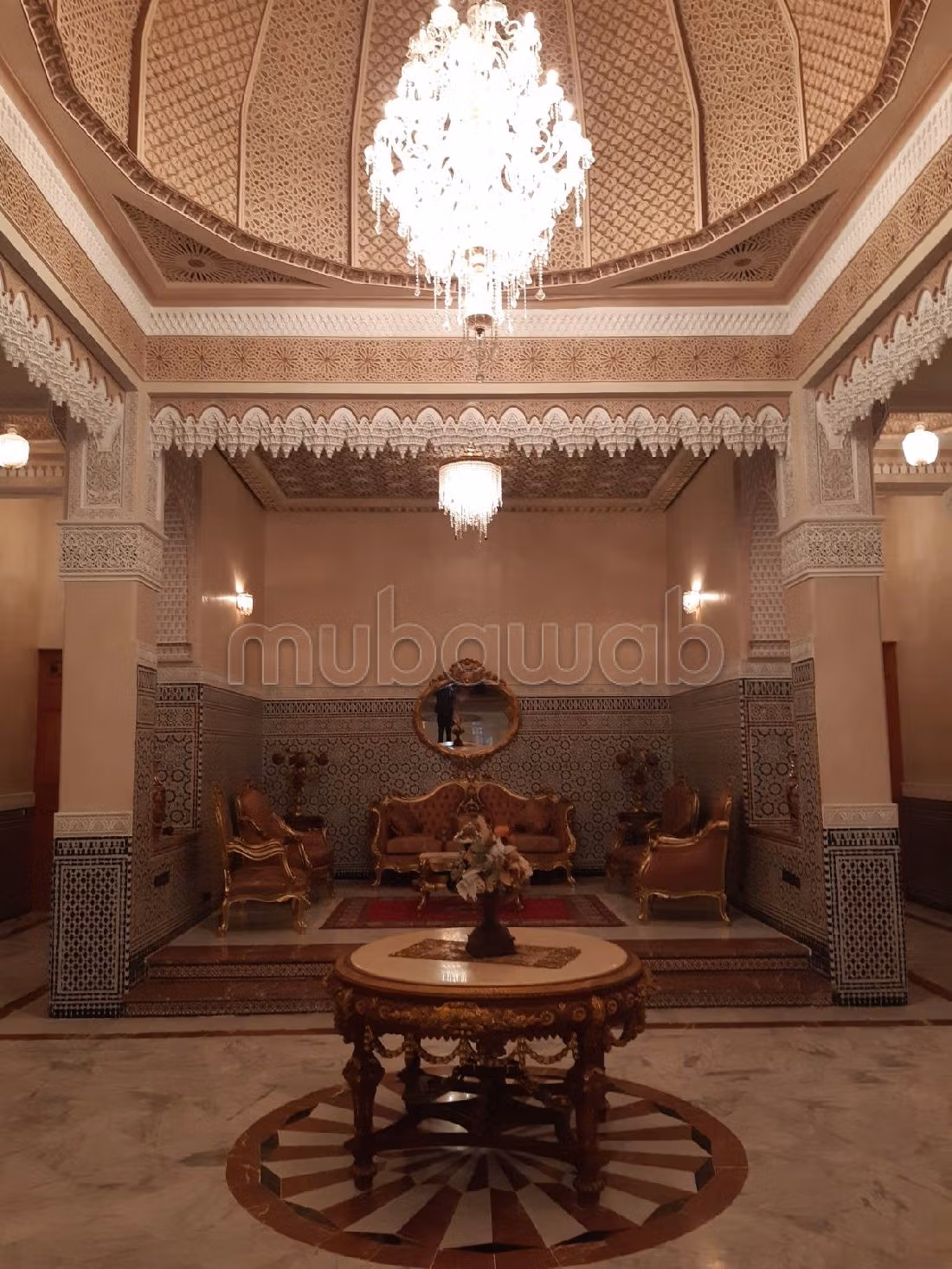 Belle propriété à vendre dans la Palmeraie (zone touristique et résidentielle), construite sur 8434 m², dans un domaine plein d’oliviers et de palmiers. À 20 minutes du centre-ville, ce palais de 2020 m² bâtis présente une architecture traditionnelle marocaine avec les meilleurs matériaux : hauts plafonds en plâtre, bois sculpté en cèdre, boiserie en noyer, marbres de haute qualité. Il dispose de 2 cuisines entièrement équipées donnant sur le jardin.