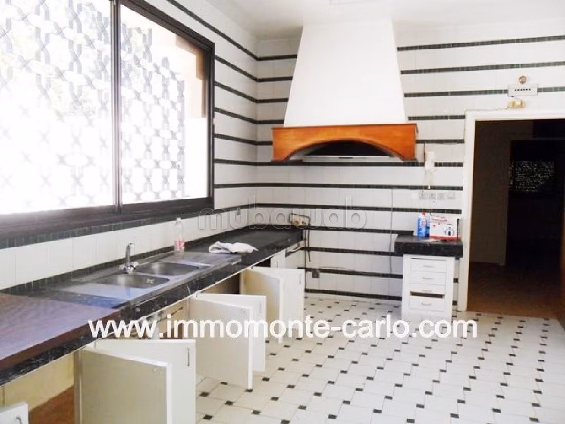Villa avec beau jardin à louer à Souissi Rabat, ensoleillée et bien sécurisée avec système d’alarme, construite sur deux niveaux, à l’entrée un patio comprend une fontaine style andalou art déco, qui donne sur une grande réception avec cheminée, chauffage dans toutes les pièces composée de: