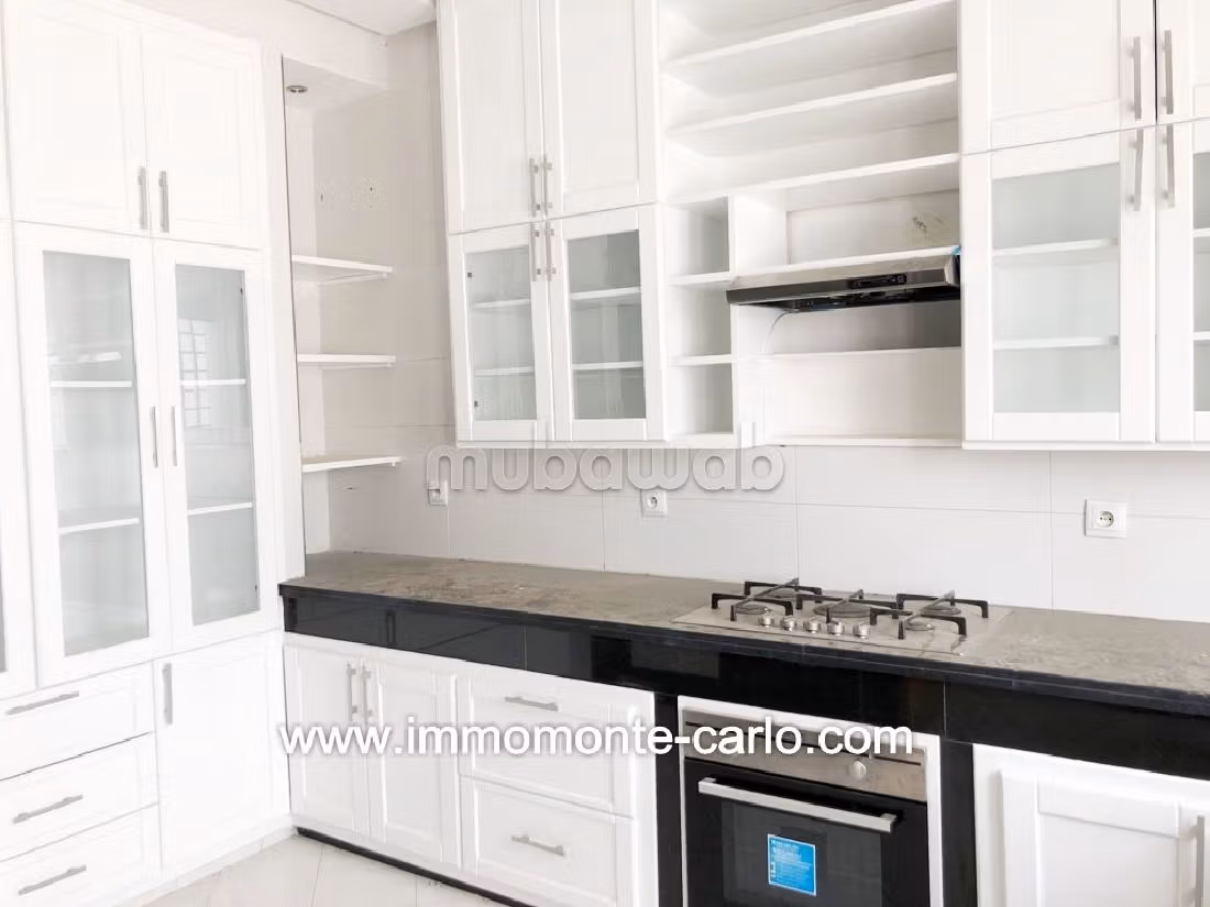 Location villa moderne neuve Hay Riad Rabat, proche de toutes commodités, villa ensoleillée et calme avec piscine dotée d’un jardin, chauffage et climatisation centralisée, isolation thermique, énergie solaire, garage avec portail automatique, vidéophone, construite sur 3 niveaux :