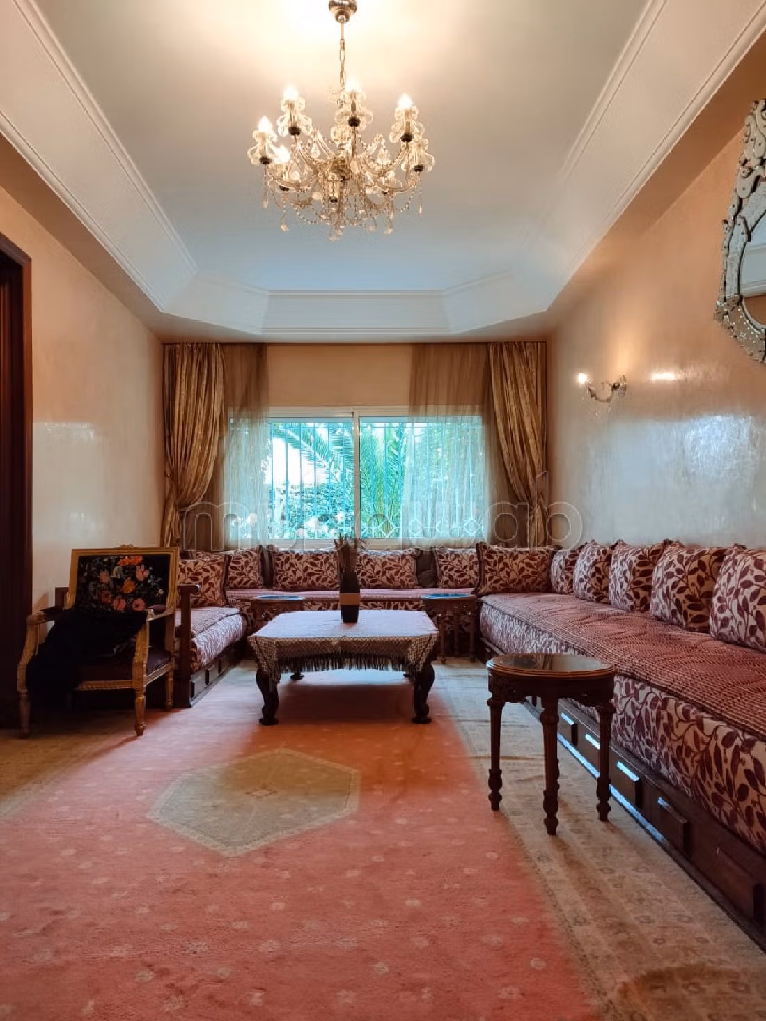 RdC : grand salon marocain, salon européen avec cheminée et vue sur jardin, grande chambre séjour faisant suite salle à manger, cuisine équipée et salle d'eau pour invités, grand jardin avec terasse.