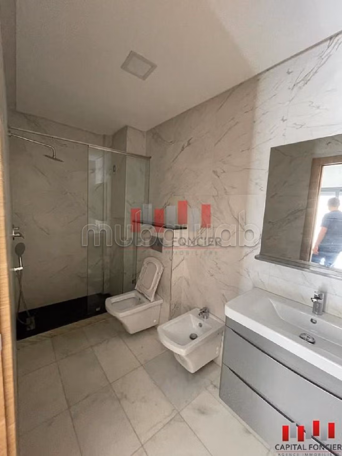 Appartement haut standing avec terrasse situé au premier étage d’une belle résidence moderne et sécurisée avec place de parking et asenceur , il se Compose d’un salon ,une suite parentale avec salle de bain une deuxième chambre avec placards, une 2 ème sdb, une cuisine équipée.