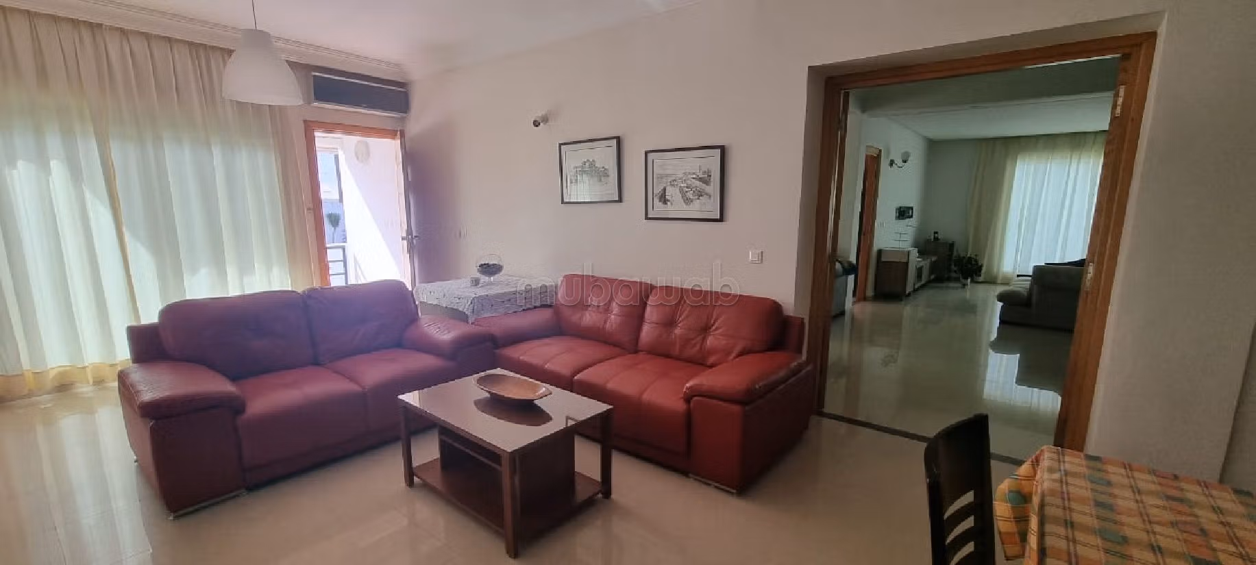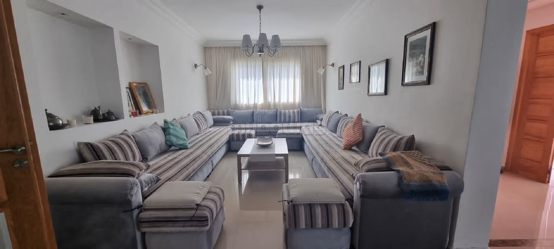 Villa meublé à louer à plage jawhara sur deux niveaux sur superficie de 485 m² de terrain et 500 m² couvert se composant de trois réception ouverte avec coin cheminée, une salle à manger, quatre chambres à coucher, une salle de bain avec Baignoire et deux cabines de douche, une cuisine équipée, , , quatre WC, un jardin, climatisation, un puits.