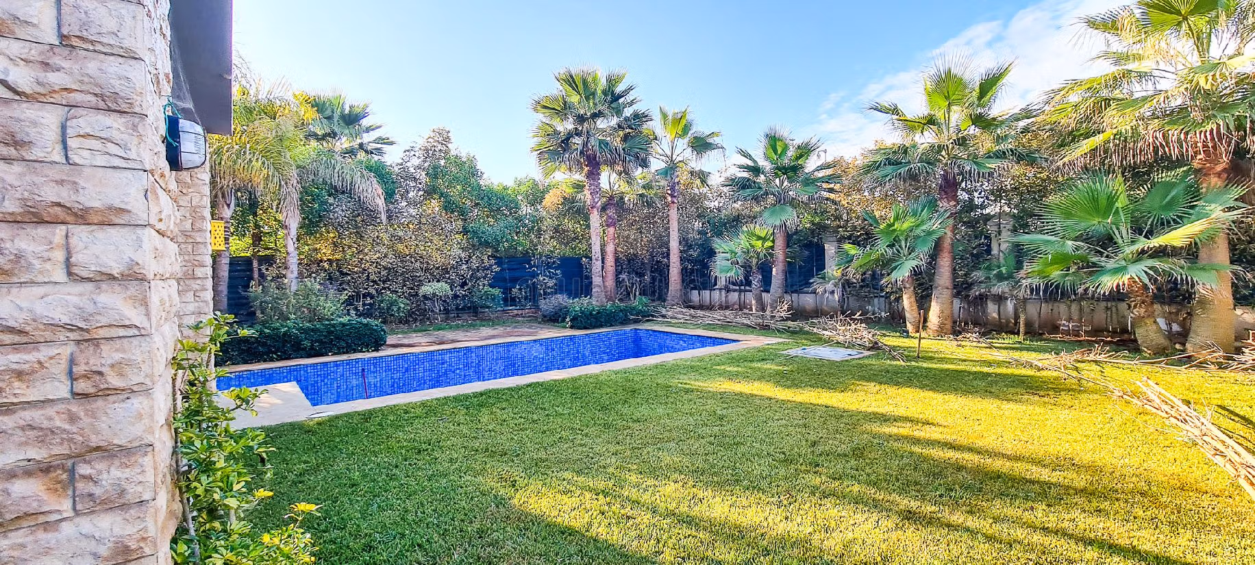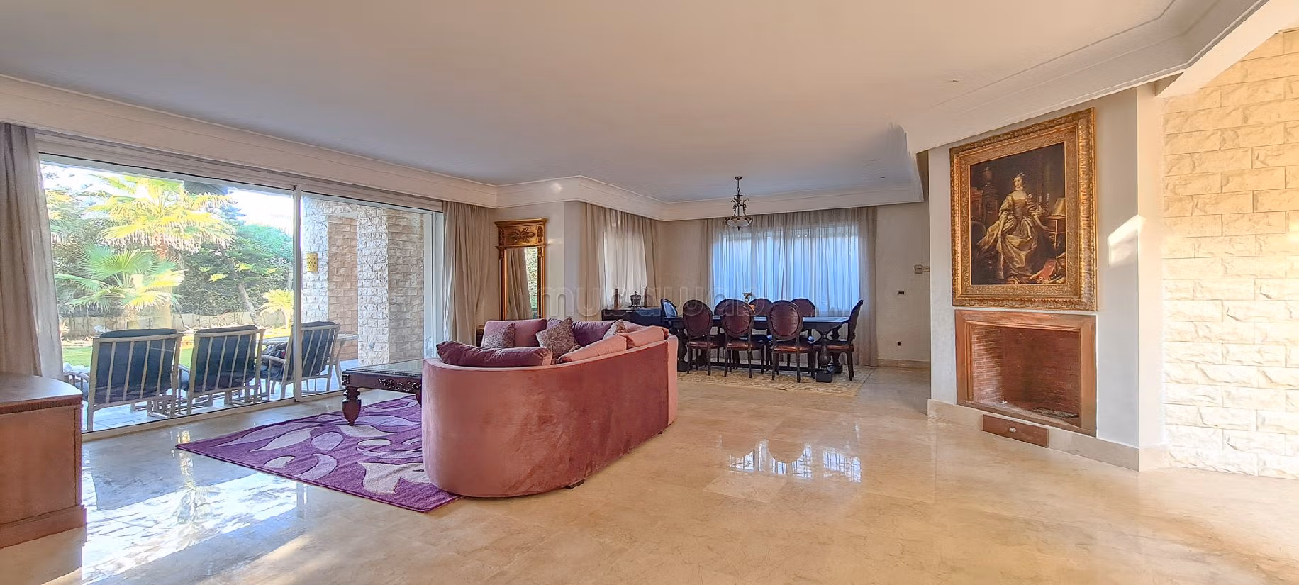 Le hall d’entrée est doté d’un escalier qui dessert les deux autres niveaux à l’étage, ainsi qu’un spatio intérieure orné d’une fontaine. Composée d’un double salon donnant sur une grande terrasse couverte, le jardin avec piscine, l’espace est organisée autour d’une cheminée. La cuisine moderne est adossée à la cheminée. L’espace buanderie et à la chambre du personnel a un accès direct sur l’extérieur. Un grand bureau est aussi disponible au rez-de-chaussée. Le tout est doté d’une climatisation centralisée et de chauffage au sol.