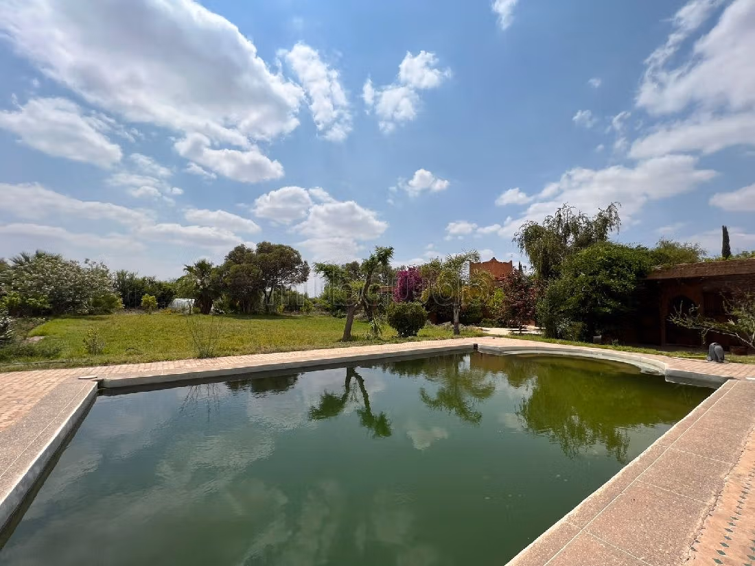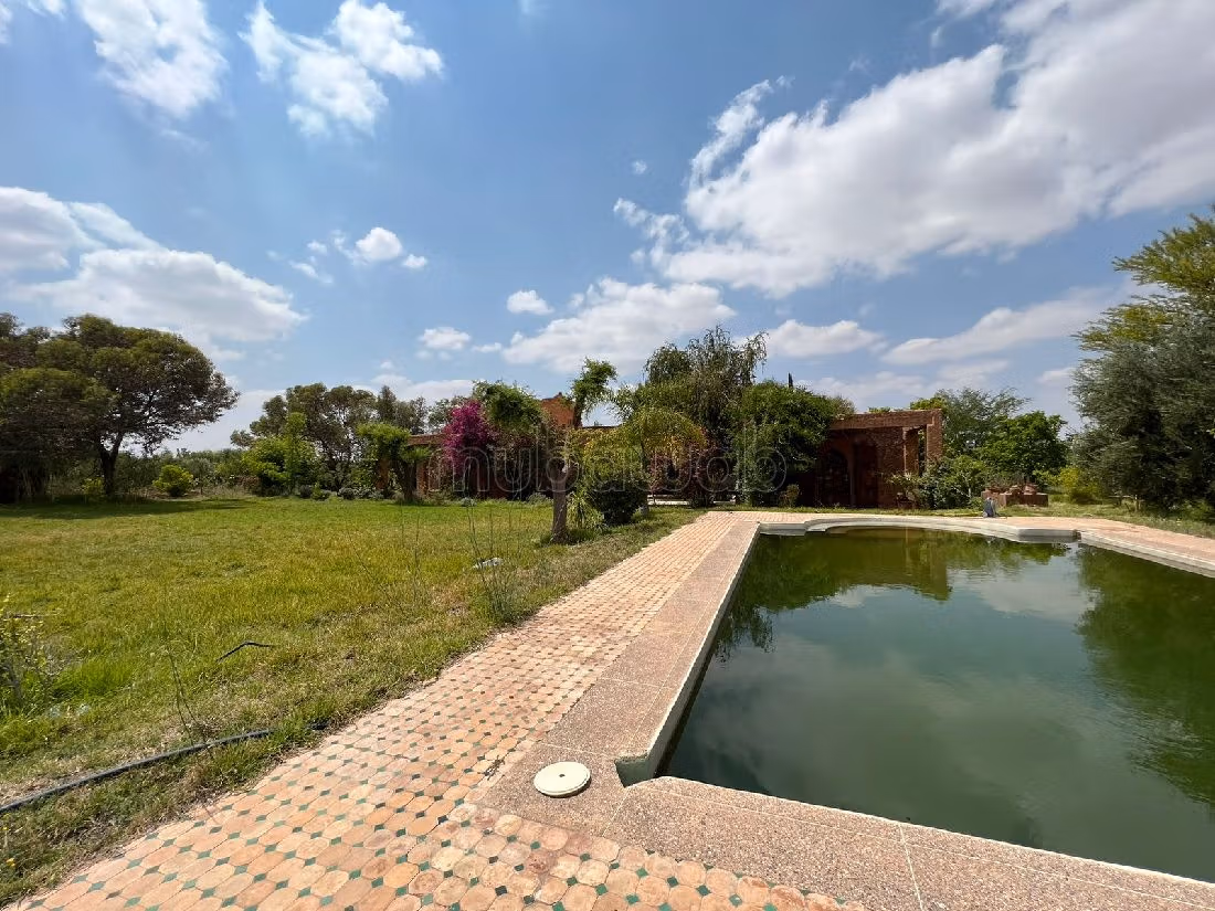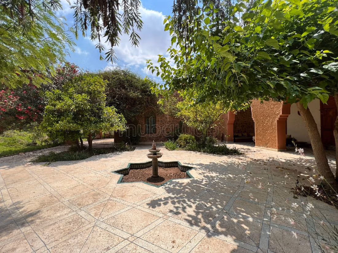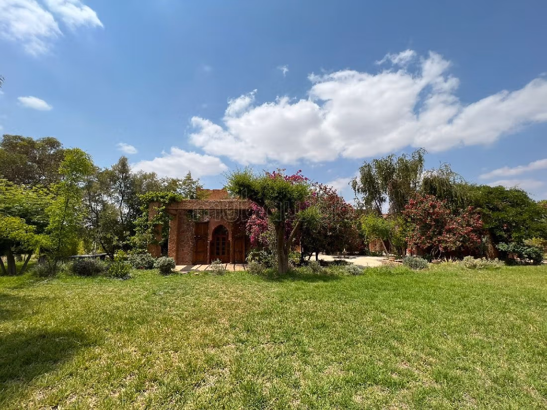 Sublime propriété bioclimatique de 6 hectares proposée à la vente située sur la route d'Ourika à 22 Km de Marrakech avec une villa style Riad construite sur 457 m² habitables. Son magnifique terrain est planté d'arbres fruitiers bio, tel que abricots, citronniers, oliviers, pêches... Cette magnifique villa est exposée plein pied avec une vue dégagée sur l'Atlas: composée d'un triple salon avec cheminée, WC visiteurs, une grande cuisine, une chambre pour le personnel, débarras, un hammam, 4 chambres à coucher avec placards, 3 salles d'eau, plusieurs espaces terrasses donnant accés au jardin avec un grand patio avec fontaine, une belle terrasse toiture ensoleillée avec un espace buanderie ou cuisine, panneaux photovoltaïques.