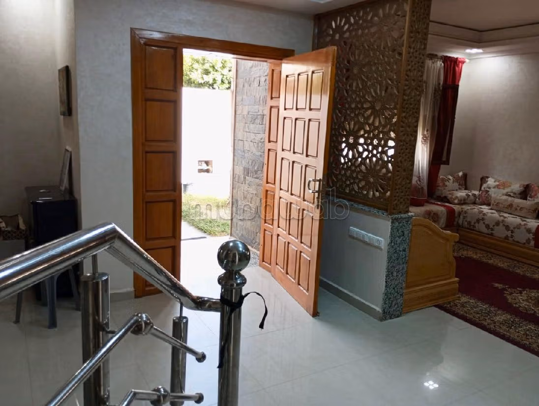 Au rez de chaussée : un jardin, trois grands salons marocains pour accueillir les invités ou se détendre en famille , une jolie cuisine bien équipée, une salle de douche avec toilette , deux garages avec deux entrées séparées , et un puit pour l'arrosage du jardin .