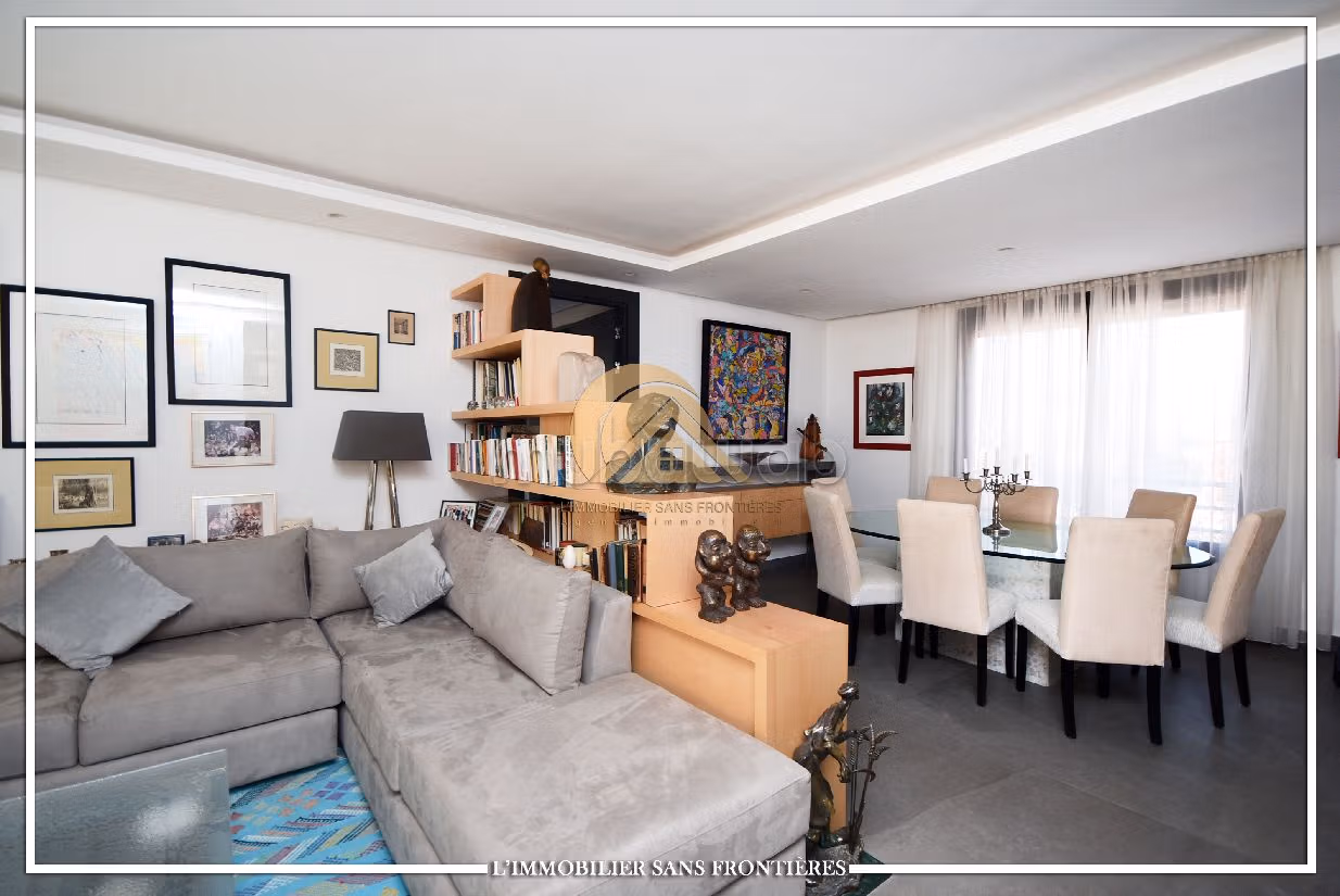 Salon européen avec cheminée et terrasse – séjour – 2 suites parentales avec salles de bains, placards et clim dont 1 avec terrasse et l'autre avec un coin bureau- cuisine équipée ouverte (Machine à laver avec sèche-linge ) – buanderie – toilette invités -Ascenseur -Parking sous sol