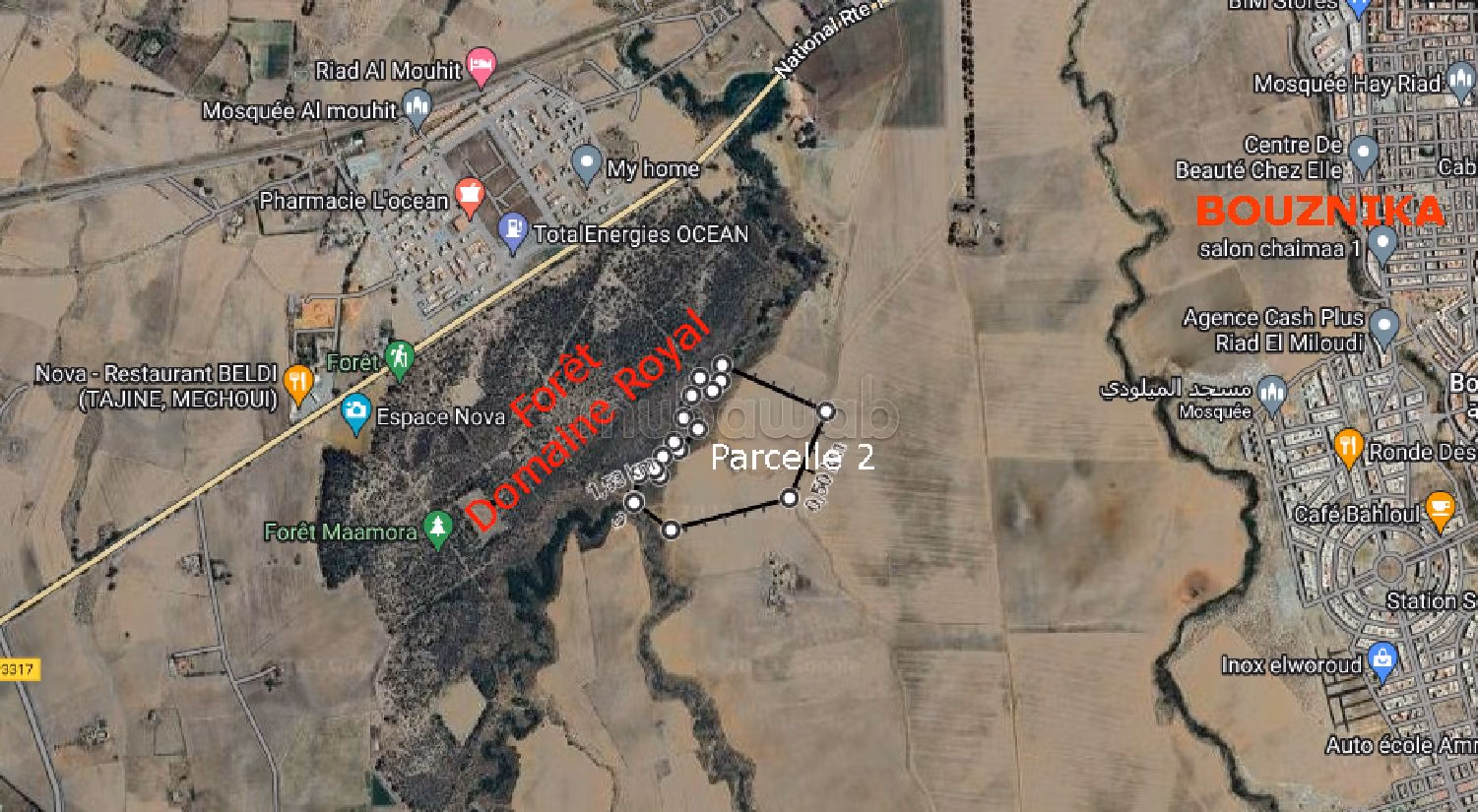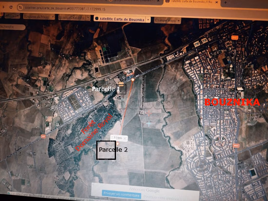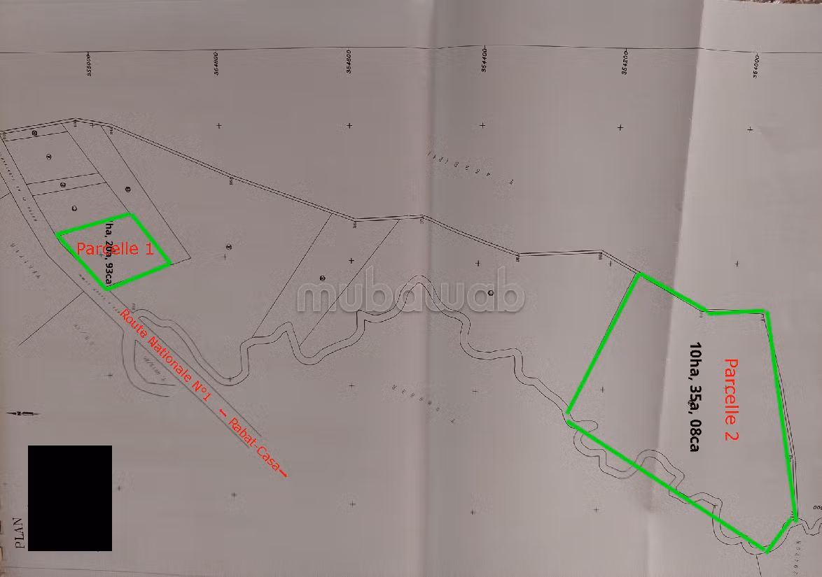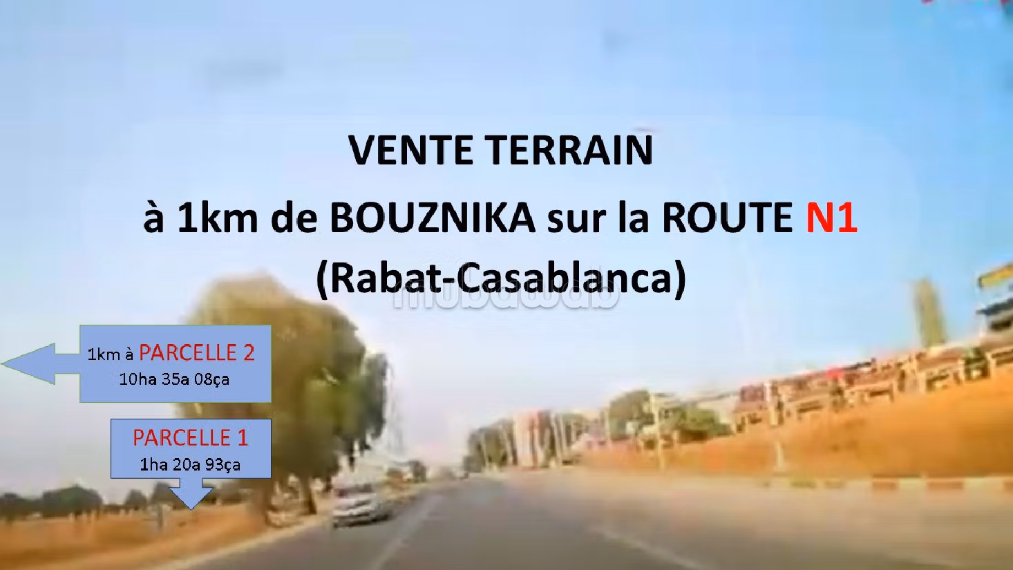 Vente Terrain titré à 1 km de Bouznika, situé sur la Route Nationale N1 (Casa- Rabat) composé de deux(2) parcelles: la 1ere parcelle d’une superficie de 1ha20a 93 ca au bord de la route N1 et la 2éme parcelle d’une superficie de 10ha 35a 08ca située à 1 km de la route N1avec accès par piste titrée, fixée par voie judiciaire de 4 m de largeur (cf : photos ci-jointes)