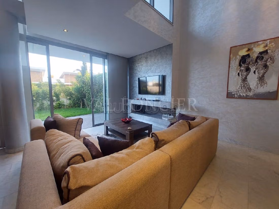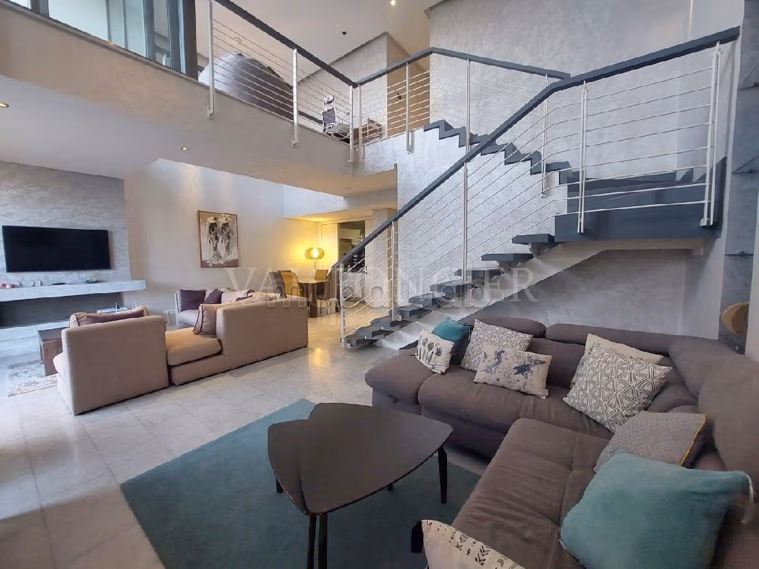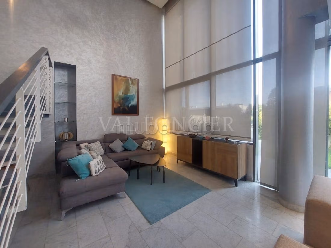 Magnifique duplex meublé moderne d’une surface totale de 225m2 garni d’un très beau jardin privé sans vis à vis, situé dans une résidence privée et sécurisée à la Ville Verte Bouskoura.