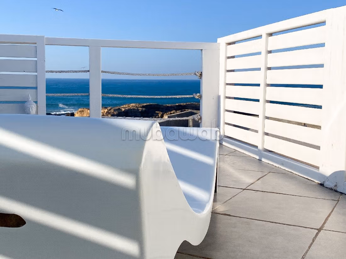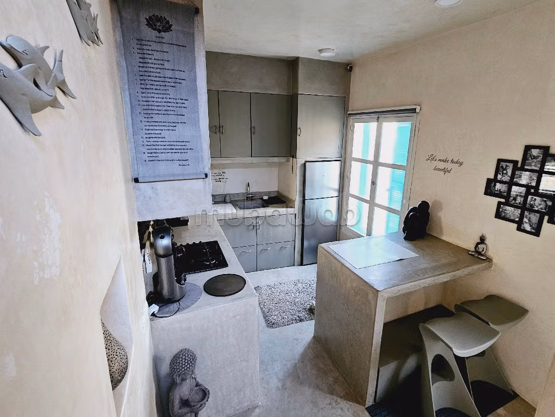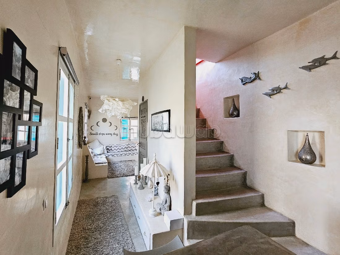 cette petite maison de médina Située dans une ruelle calme de la médina, non loin des remparts, vous séduira dés la porte franchie, sur la ruelle deux belles portes ouvrent, une sur l’entrée d’où les escaliers démarrent pour desservir les quatre niveaux et l’autre sur un cagibis idéal pour stoker des vélos, des poussettes ou des objets encombrants. Au premier niveau une belle chambre avec fenêtre sur façade et une salle de bain y faisant face séparée par un couloir, de nombreux rangements faits sur mesures, optimisent la place et rendent l’endroit tout de suite agréable. Au deuxième une chambre et une salle de bains avec des couleurs différentes et toujours des rangements sur mesures optimisant l’ensemble, les larges fenêtres sur façade confèrent à la maison une luminosité très appréciable. Au troisième niveau c’est l’espace vie avec le salon d’un coté et la cuisine équipée de l’autre, la couleur chaude et lumineuse rend ces pièces très agréable à vivre.