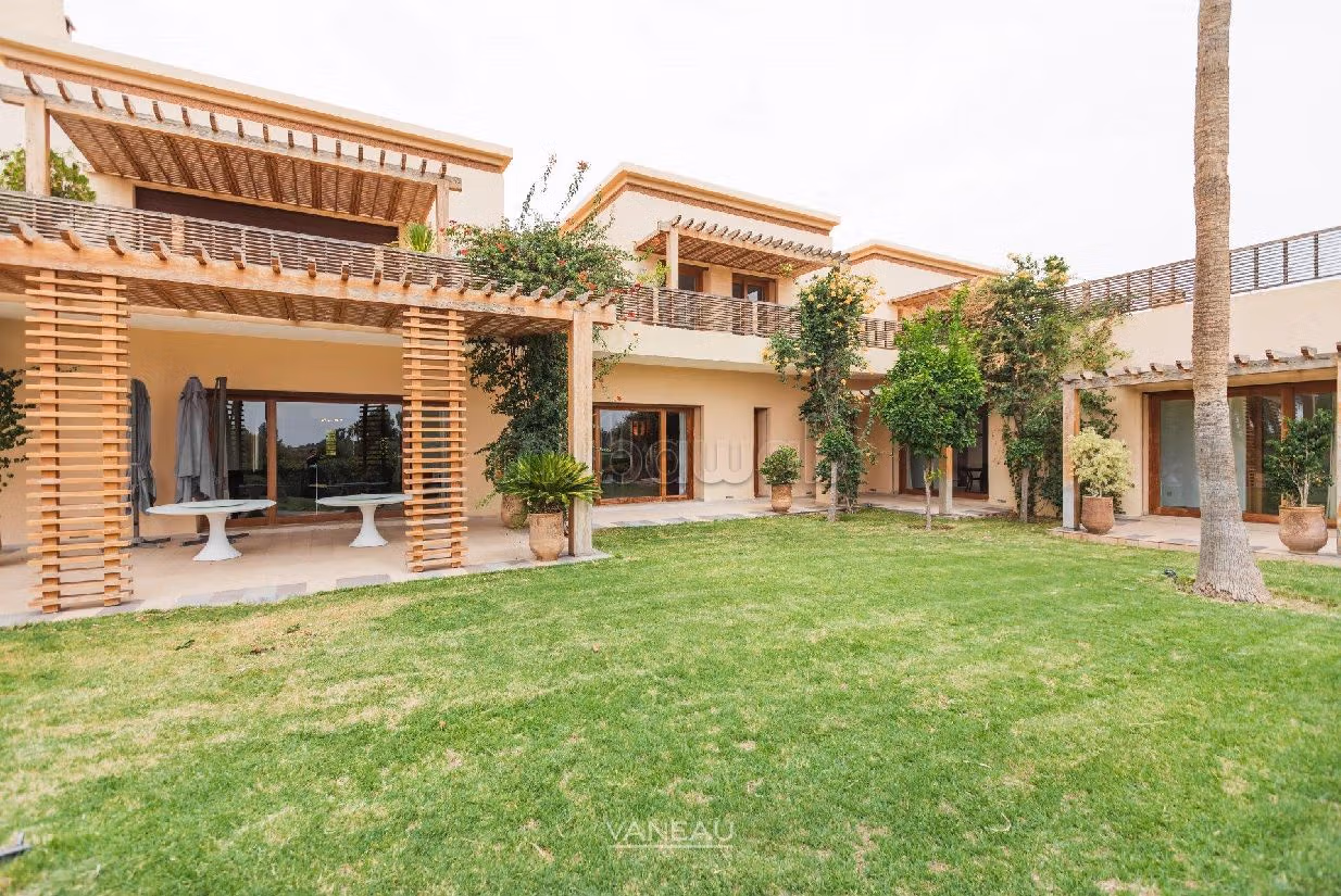 Superbe Villa Contemporaine Front de Golf Vaneau Maroc vous propose une superbe Villa en première ligne de Golf érigée sur un terrain de 2000m2 à seulement 15 minutes du centre ville de Marrakech. La villa de 850m2 est bâtie sur 3 niveaux. au RDC, Un superbe triple séjour donnant sur le jardin, avec un salon Marocain traditionnelle et le reste d'architecture contemporaine. 3 chambres sont également disponibles au RDC. Les finitions et boiseries sont de très haut standing. Au -1, tout l'éspace pour le personnel ainsi qu'une salle de cinéma, un magnifique Hammam traditionnel et un éspace de 80m2 résérvé pour une salle de sport ou de Yoga. L'entre sol tourne autour d'une cour anglaise qui offre luminosité naturelle aux pièces. A l'étage, une superbe suite parentales et 2 autres chambres offrant un accès privilégié à la terrasse et une vue somptueuse sur les montagnes majestueuses du Haut Atlas. Tout nos biens sont vendus titrés.