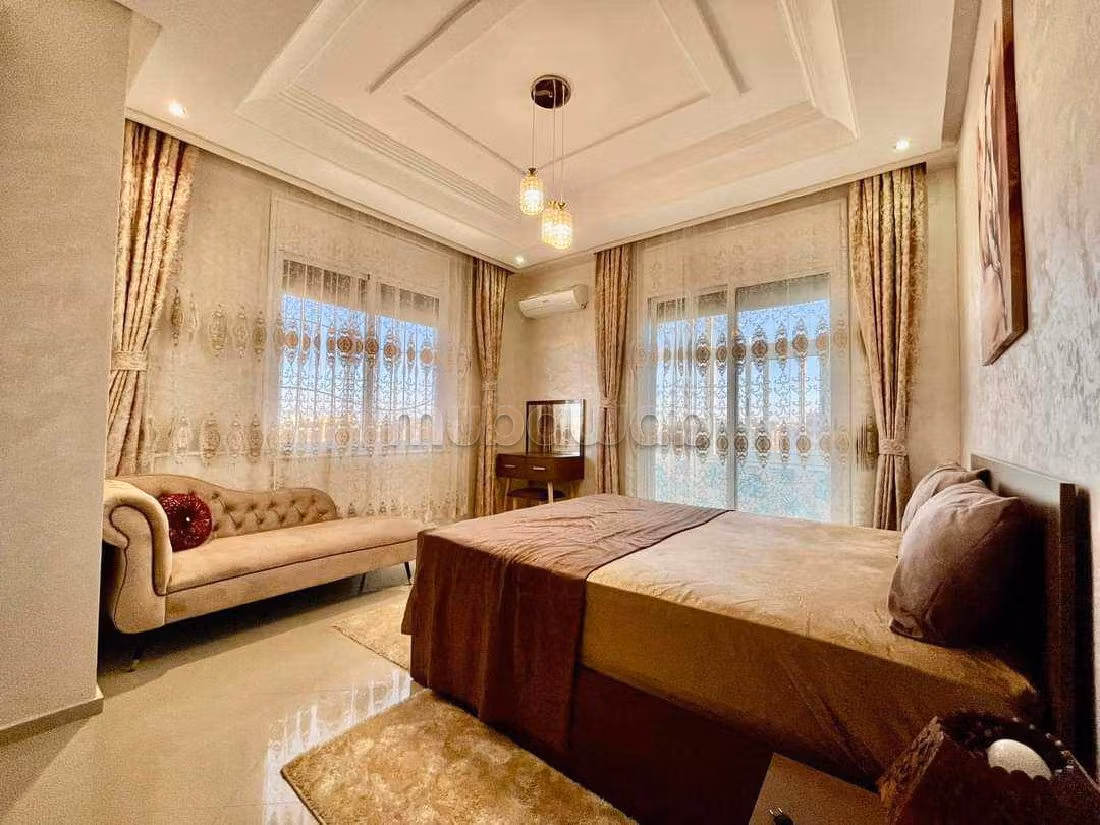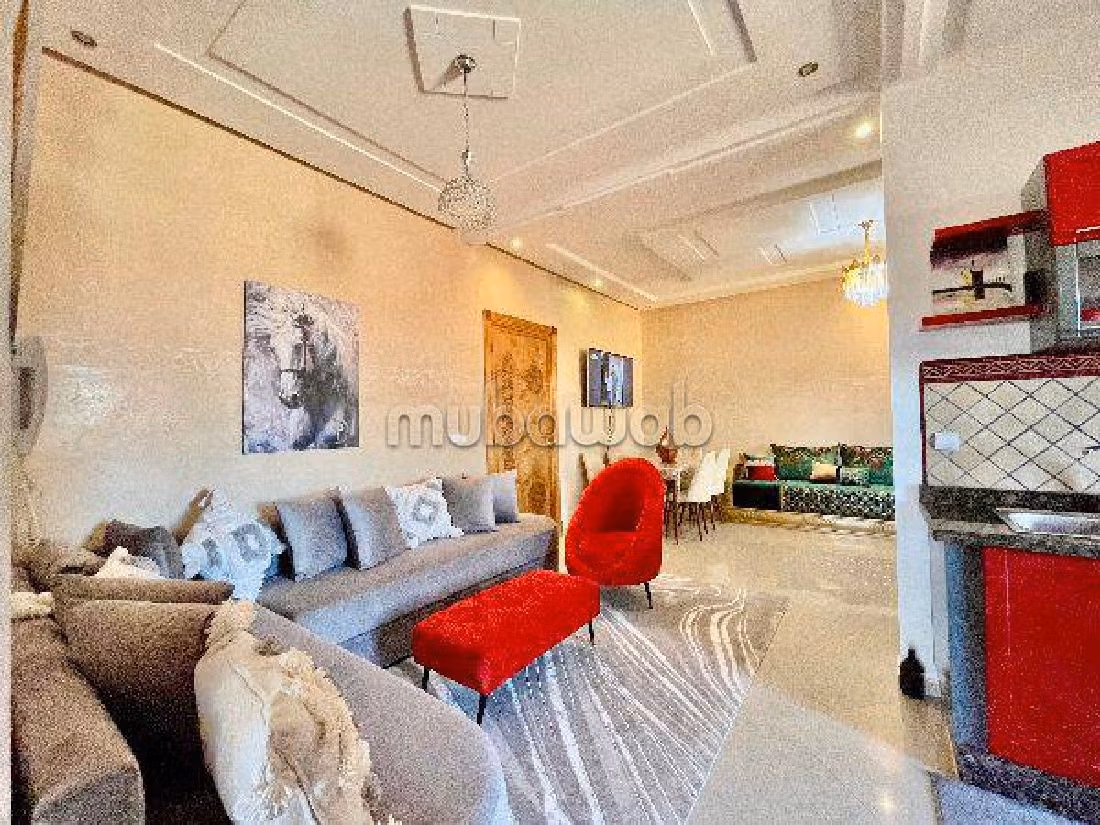 situé dans une résidence sécurisée, ce bel appartement, entièrement meublé et aménagé, composé de 2 belle chambres, une salle de bain avec cabinet de douche, un spacieux salon marocain tv, 1 séjour et une cuisine ultra équipée avec accès à un petit balcon.
