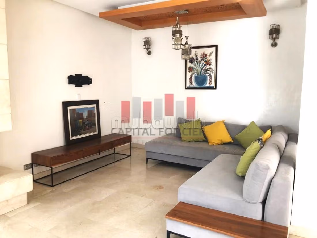 BOUSKOURA Très joli villa semi meublée , située dans une résidence fermée et sécurisée à Bouskoura , elle se compose d’un double salon avec coin cheminée donnant sur un jardin arboré avec piscine , un coin salle à manger , une salle d’eau , et une cuisine entièrement équipée avec chambre de personnel . A l’étage 3 chambres dont la suite parentale avec dressing ...BOUSKOURA