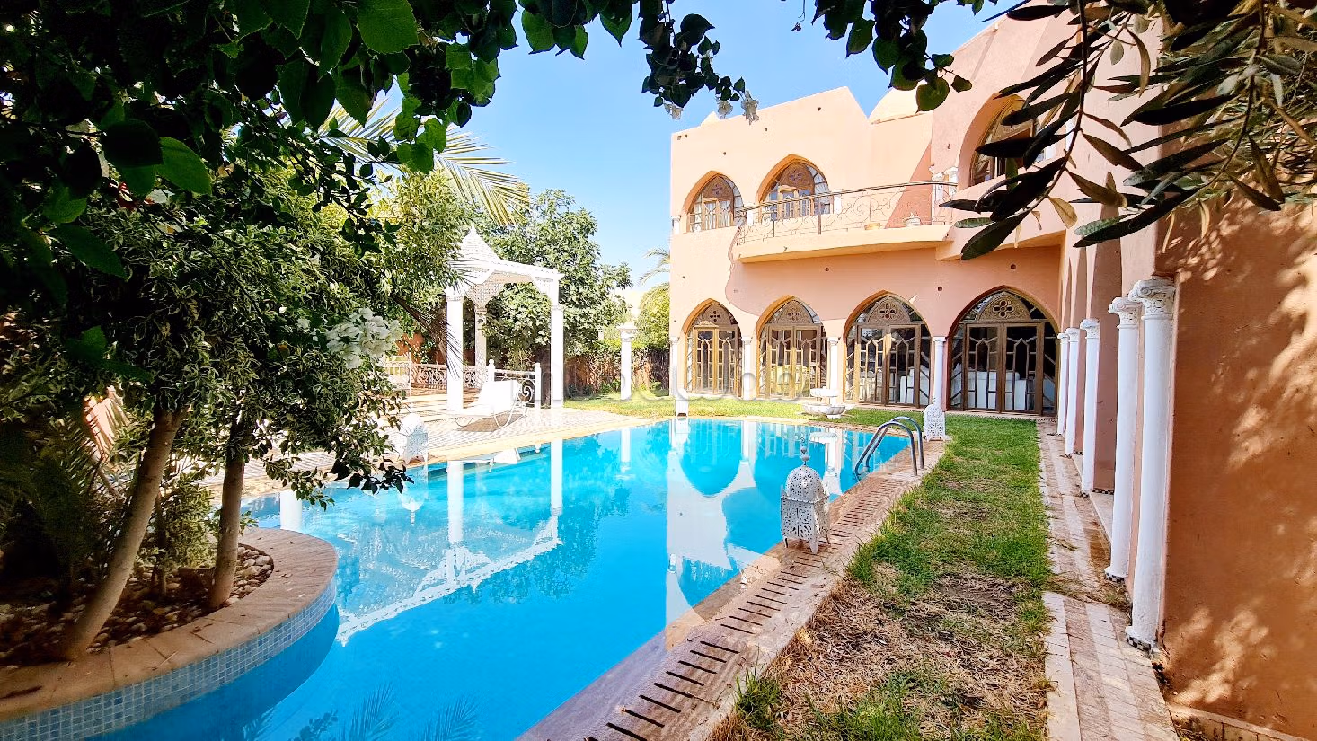 Cette belle villa comprend 5 chambres chacune avec salle de bain privative dont 2 suites, double salon avec cheminée ouvrant sur le jardin, Salon marocain, Salle à manger , Cuisine équipée, Hammam beldi, jardin bien entretenu avec une pergola et une grande piscine individuelle.