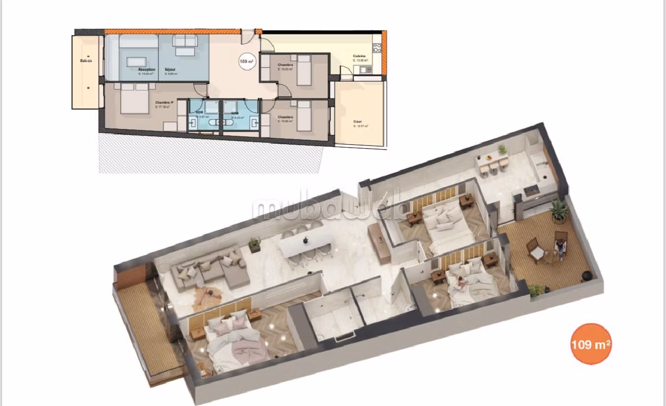 Dans un secteur résidentiels du centre ville, cet appartement exceptionnel très lumineux de 96m, fait avec matériaux de qualité haut de gamme, appartement au 3eme étage, il est compose comme suite : une entrée, un coin salle a manger, un vaste salon avec terrasse, 2 chambres dont une suite avec salle de bain et toilette, la 2eme chambres avec une salle de bain et toilette séparée avec terrasse communicante, une cuisine équipée, un appartement avec un agencement généreux, ce bien aux nombreux atouts : luminosité, proche des commerces et des écoles, ascenseur, place parking sous-sol et idéal pour investissement.