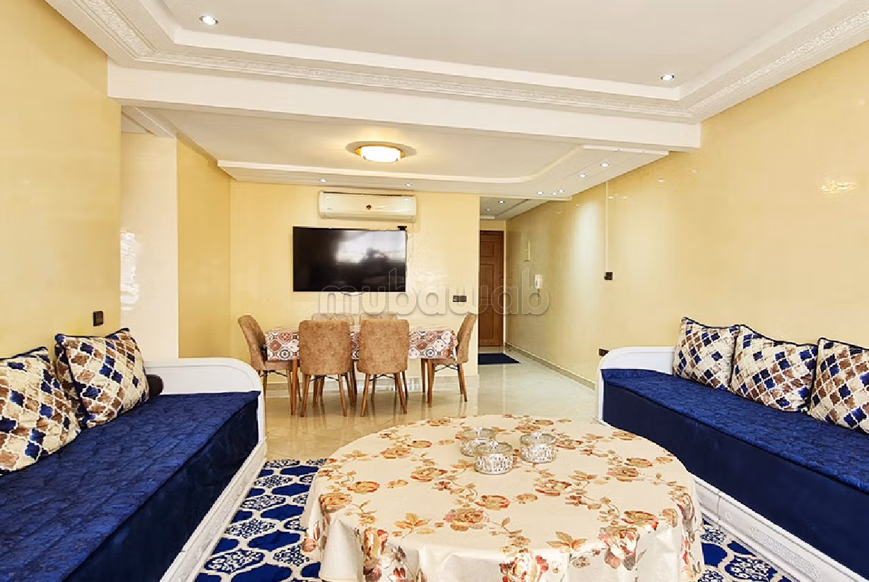 En plein cœur du centre-ville de Kenitra, cet appartement meublé, situé au 5ème étage d'une belle résidence avec deux ascenseurs, est disponible à la location pour des durées de 6 mois ou plus.