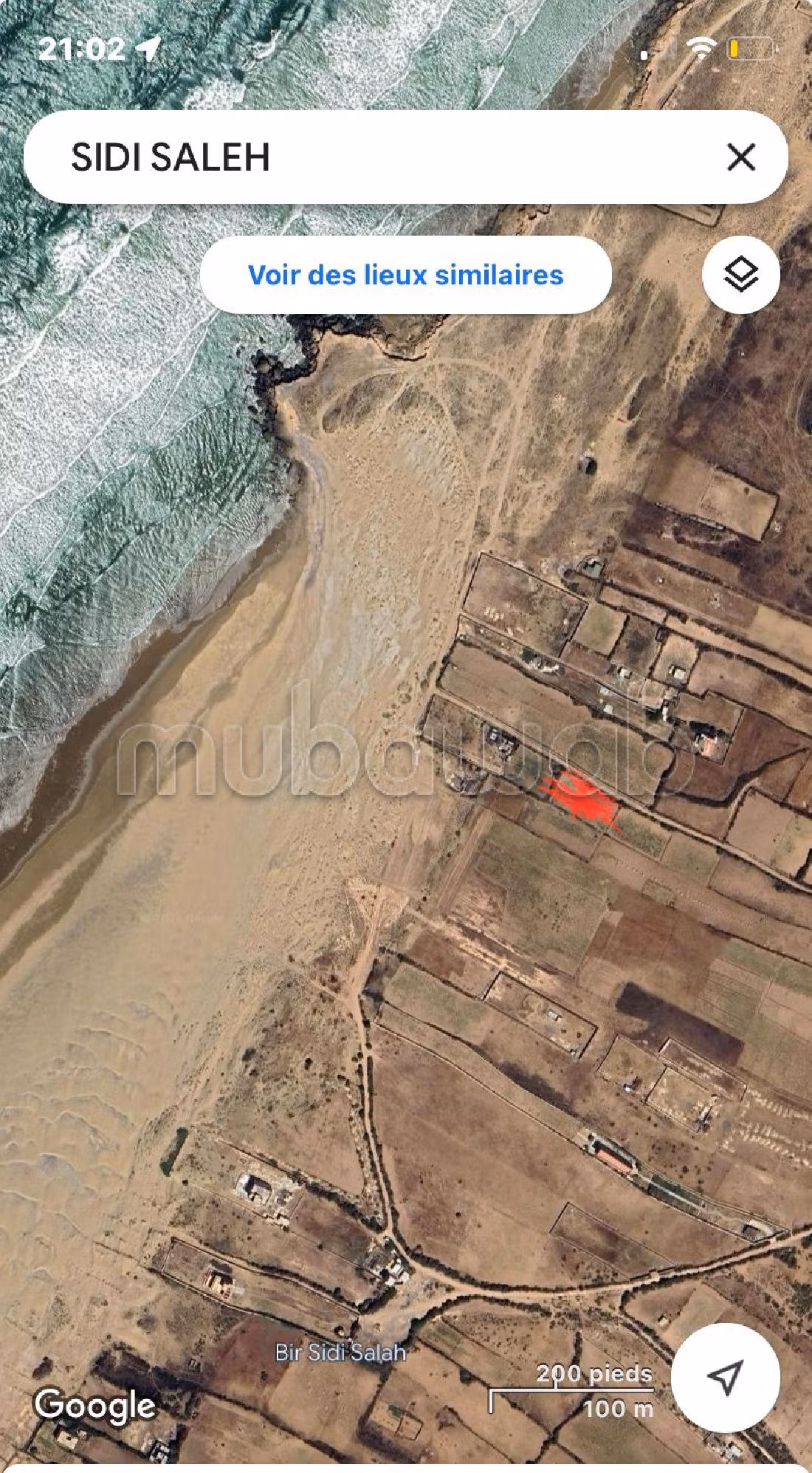 Terrain titrée avec certificat (Pied dans l'eau) sur la route côtière n 301, reliant Safi et Essaouira (50 km d'essaouira et 70 km de Safi ),Accès direct à la plage. donnant directement sur la plage de Bhibah-Sidisalah ( à 200 m). Superficie 1050 mètres carrés. Pour voir l’endroit sur Google Maps (SIDI SALEH Drier, Maroc) ou ( Bir Sidi Salah )