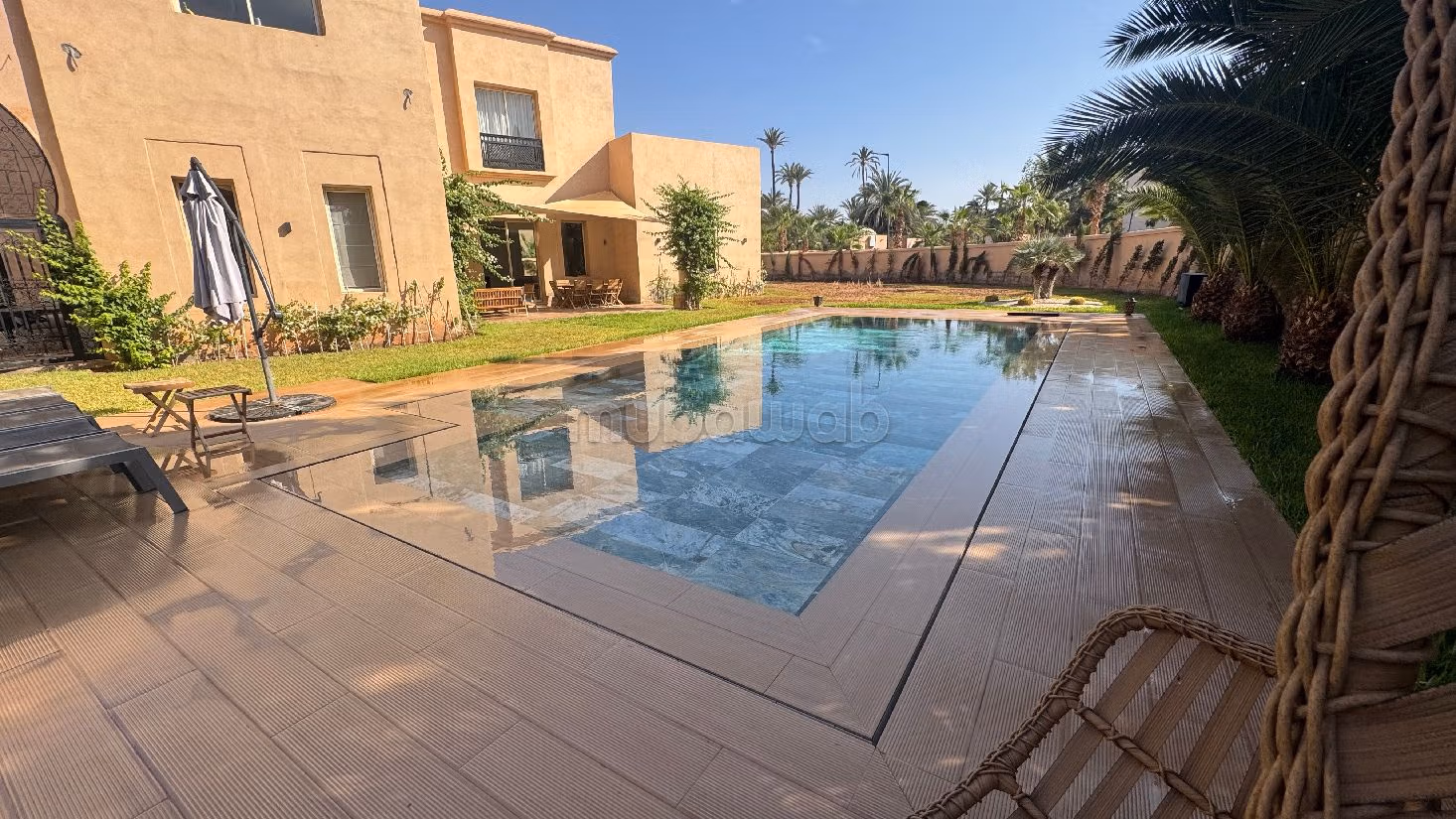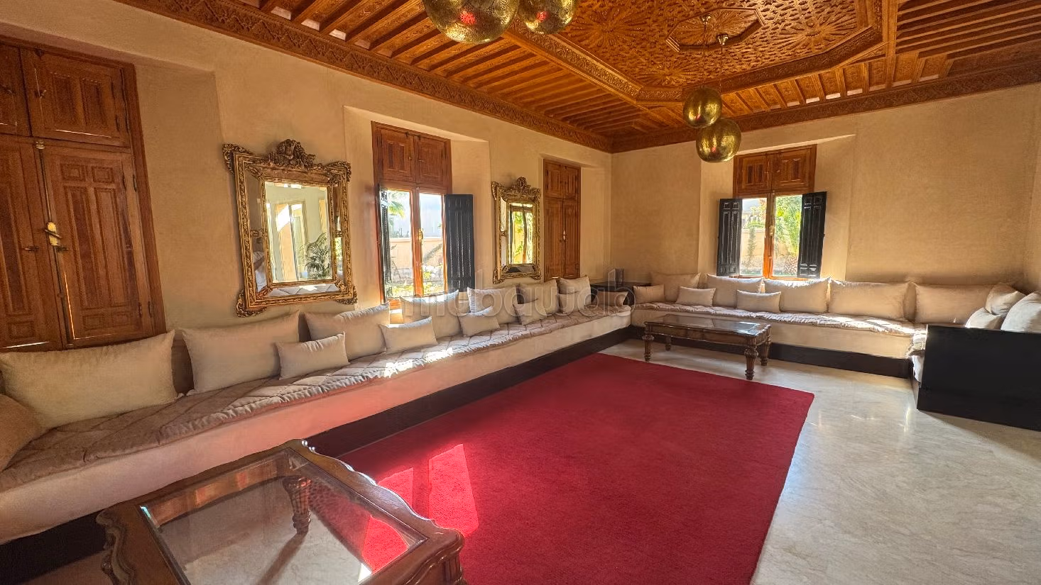 • Rez-de-chaussée : un vaste salon marocain, un séjour avec coin cheminée, deux grandes suites avec accès direct au jardin et à la piscine, ainsi qu’une cuisine spacieuse récemment rénovée.
