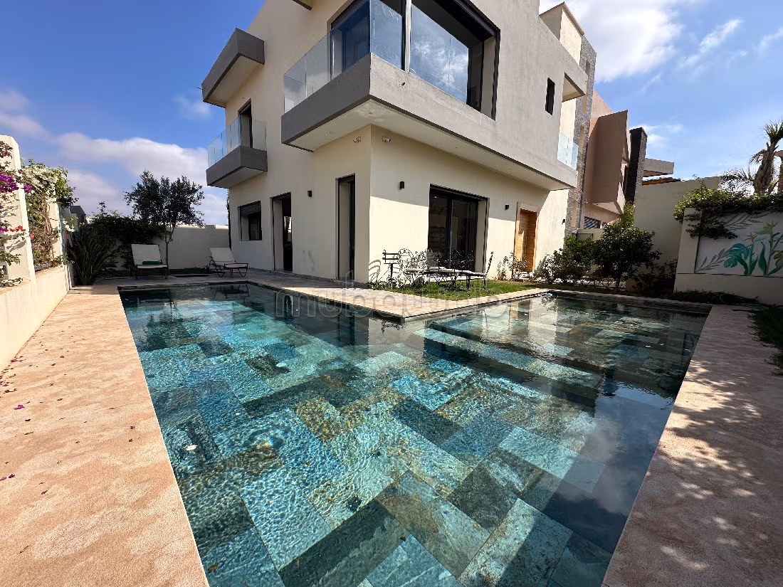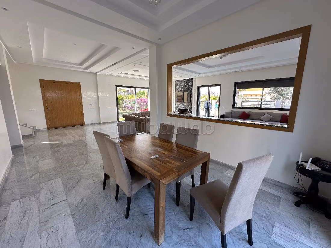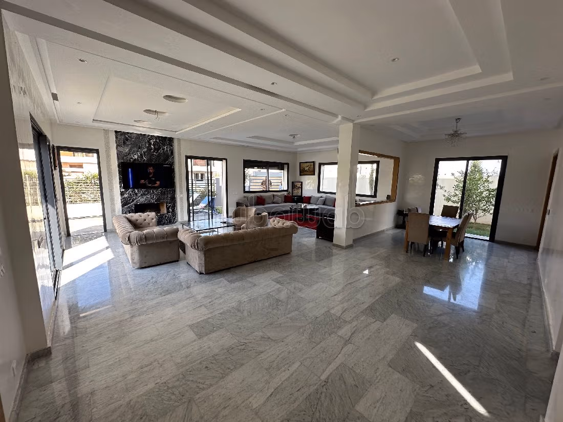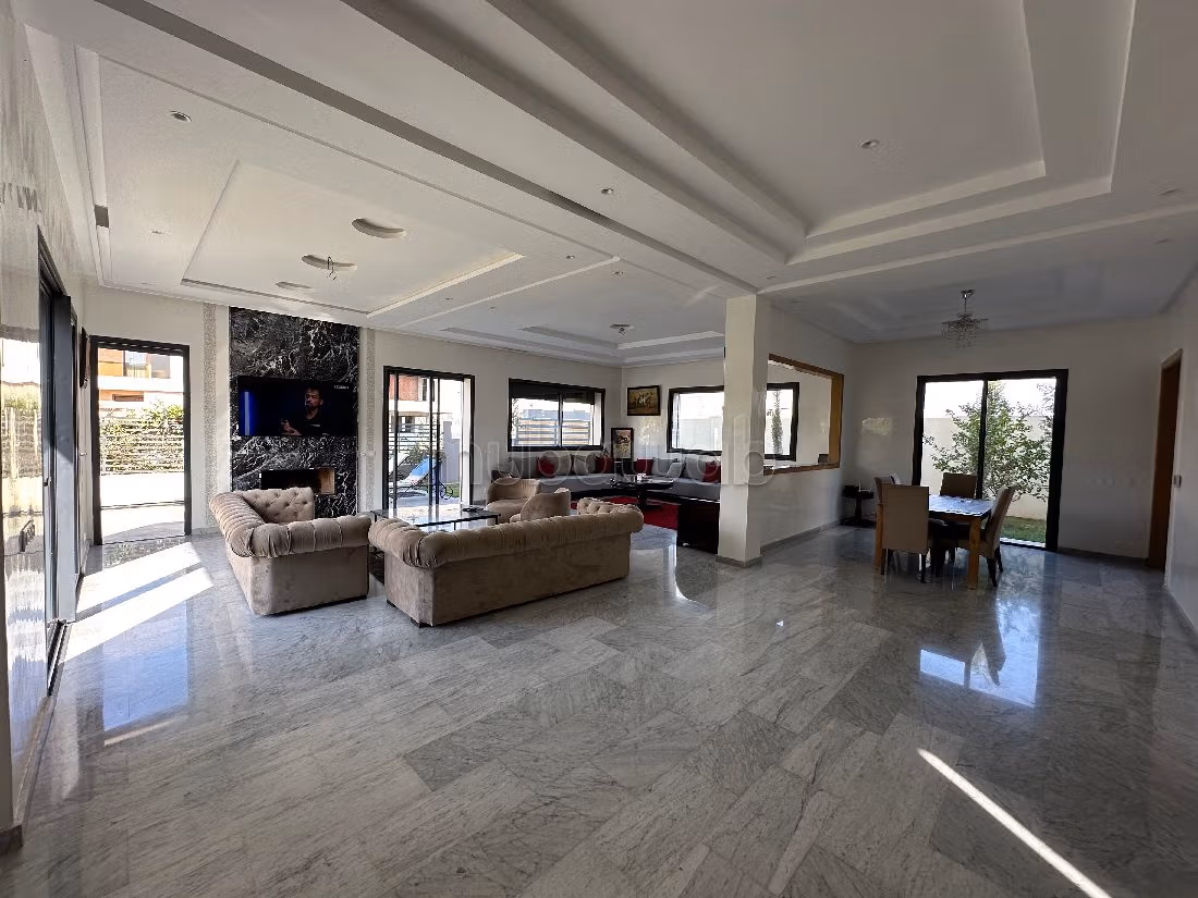 Incantevole villa in vendita. Prezzo 5 600 000 DH. 4 camere da letto, 3 bagni, 400 m². 6 locali. Meno di 5 anni. Tipo di pavimento: Marmo. Comfort e sicurezza con la porta blindata, il sistema di videosorveglianza, l'antenna parabolica e un magnifico salone tradizionale marocchino.