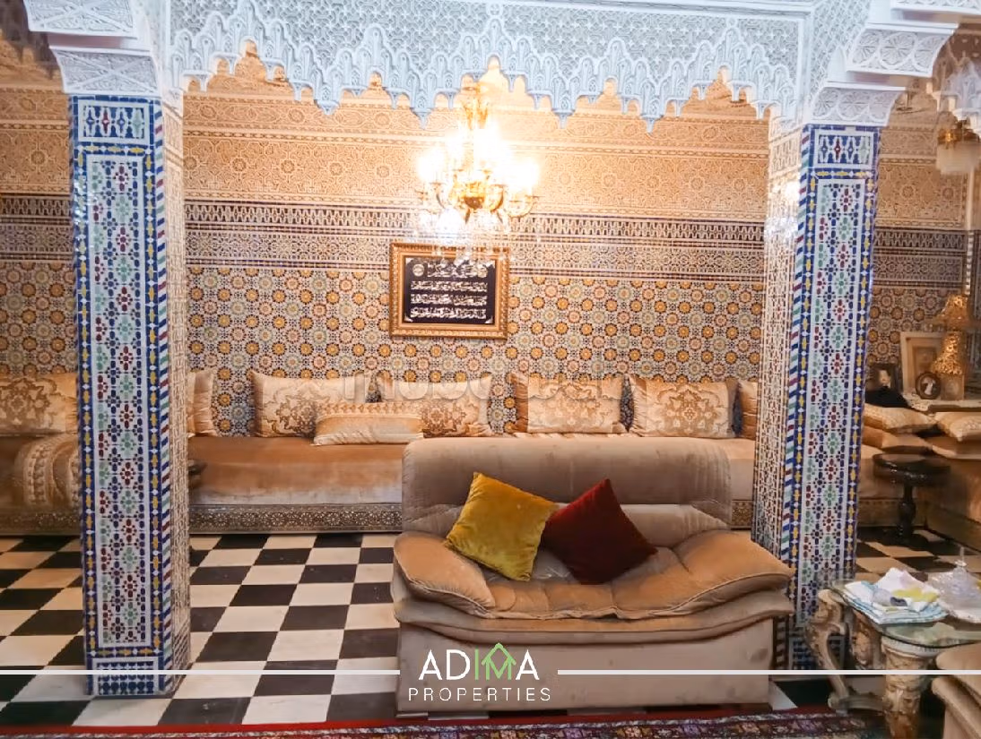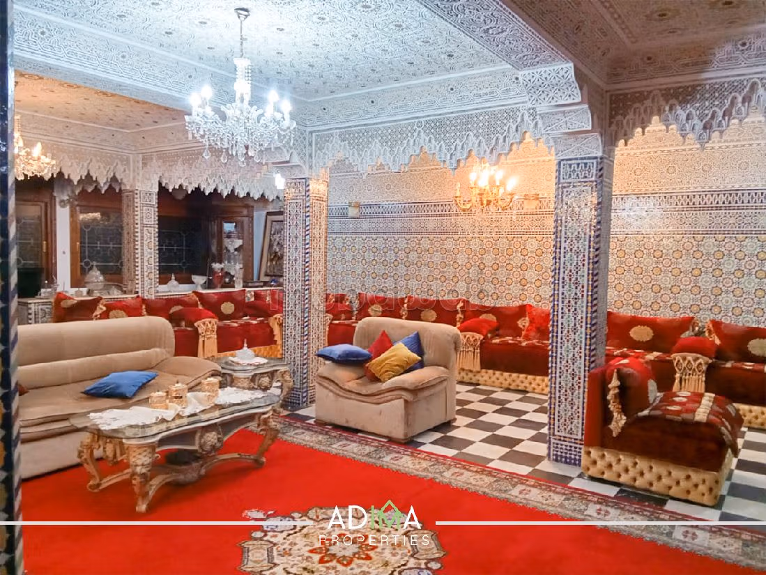 Questa splendida villa è in vendita . Questo salotto marocchino tradizionale rende speciale la casa. Spazioso soggiorno in stile europeo.