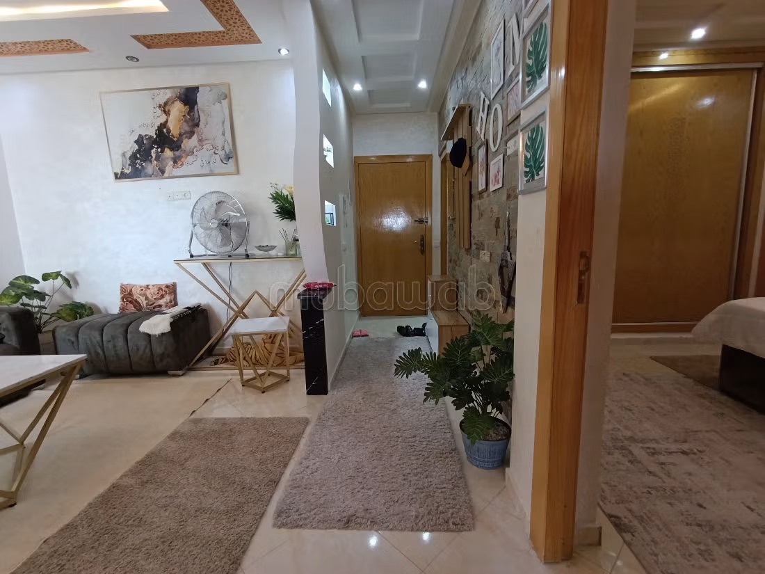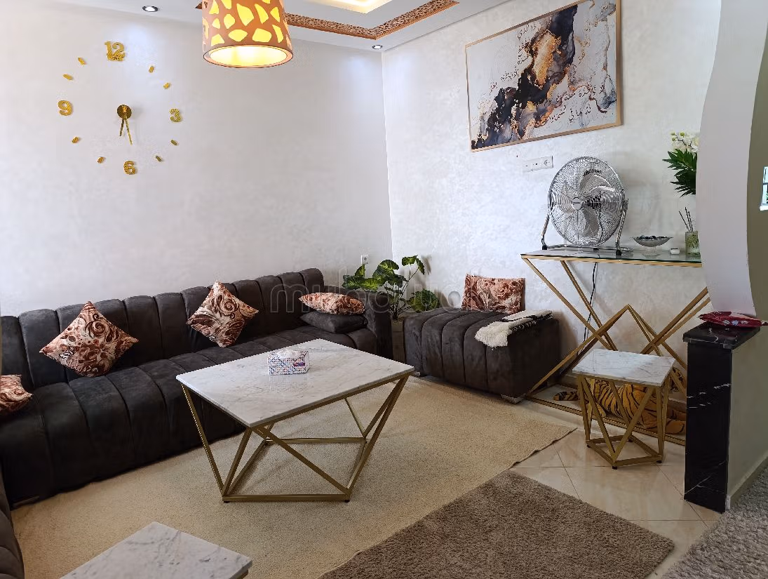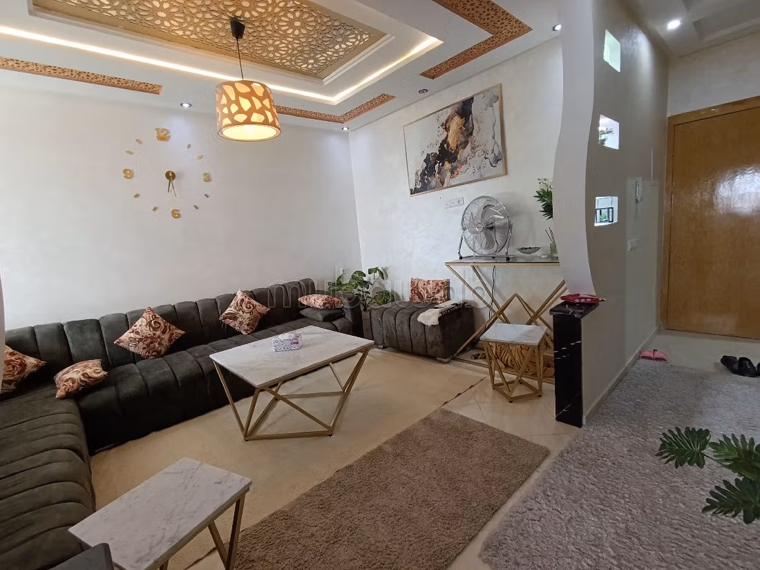 Appartamento in affitto stagionale a El Hadadda. Goditi il comfort del salone tradizionale marocchino con parabola e la sicurezza della porta blindata. Sistema di climatizzazione.